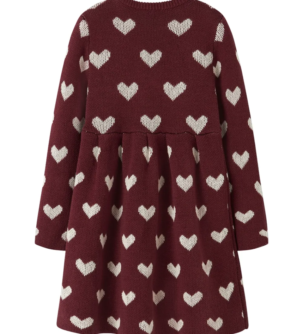 Sød Name It kjole i mørkerød med hvide hjerter. Kjolen har en strikket struktur. Den har med rund halsudskæring med ribkant og lange ærmer. Kjolen har en syning ved taljen, som giver skørtet god vidde.