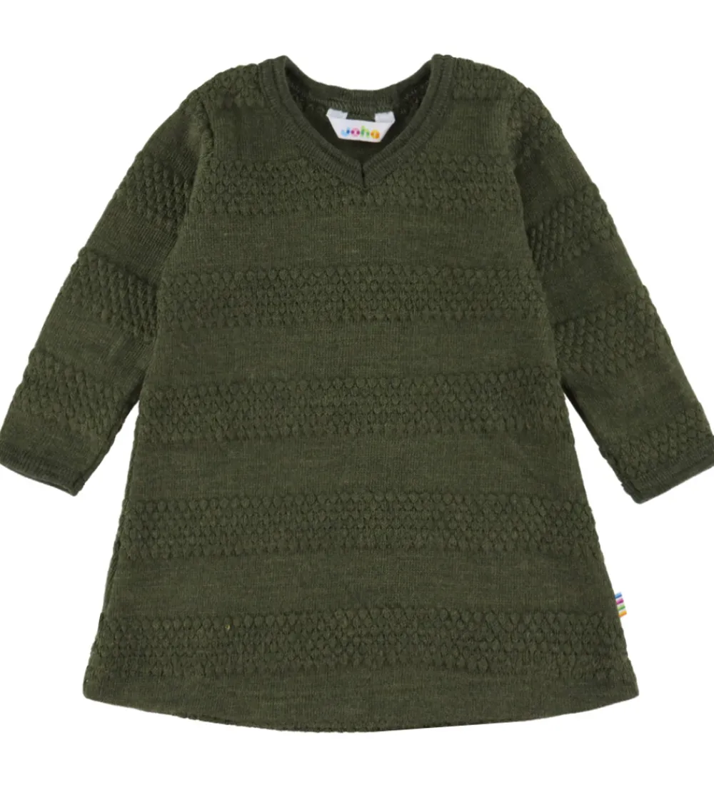 Elegant Joha kjole i mørkegrøn strik med stribet struktur. Kjolen har en enkel v-udskæring og lange ærmer. Den er lavet i blødt merinould.