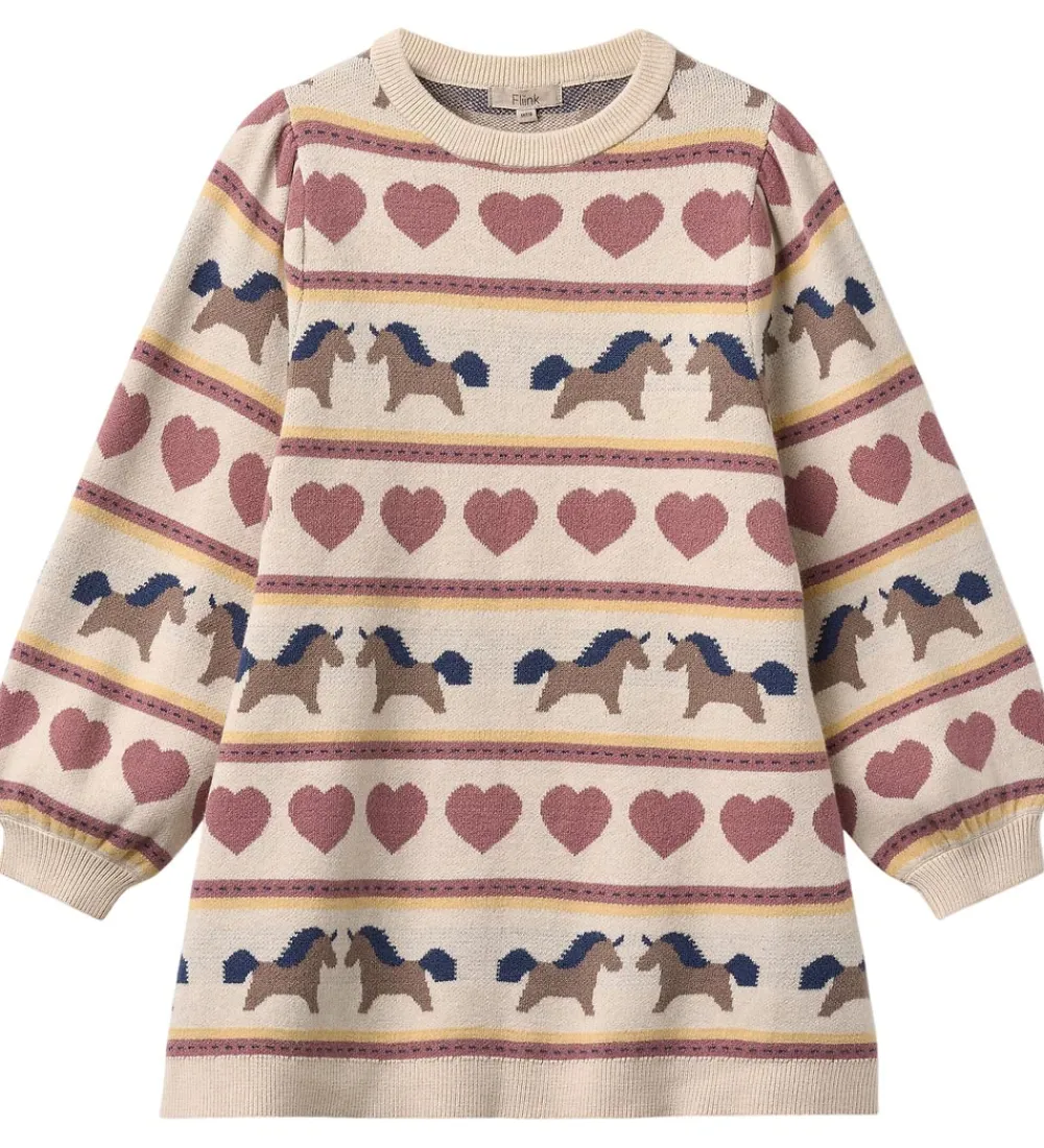 Fin Fliink kjole i beige med et mønster af hjerter og heste i rosa, brune og blå nuancer. Fliink kjolen har en rund halsudskæring og lange ærmer med rynker ved skuldrene. Den er fremstillet i en meget blød kvalitet.