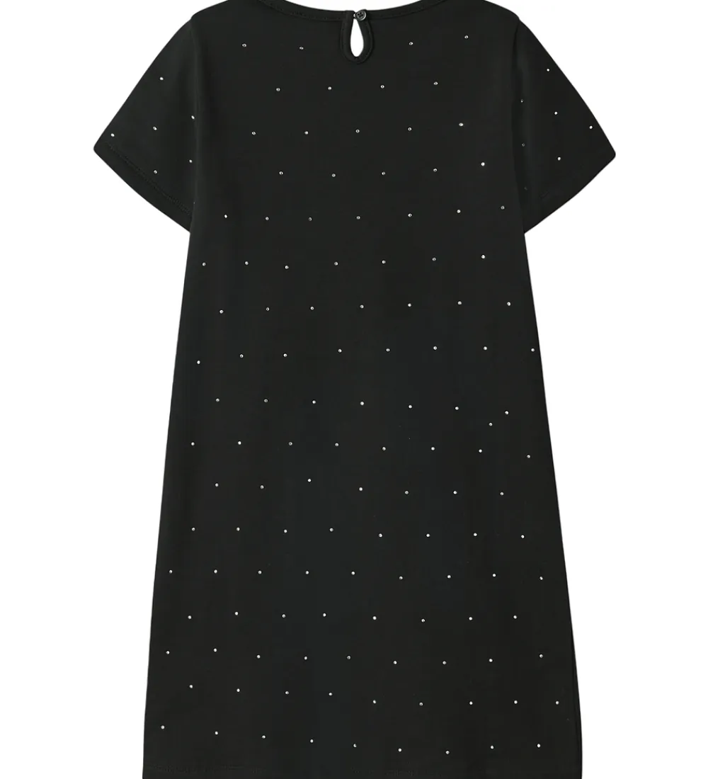 Elegant Name It kjole i sort med små similisten i sølv. Name It kjolen har korte ærmer og en rund halsudskæring med en knap i nakken. Kjolen er lavet i sweatkvalitet med en blød, børstet inderside.