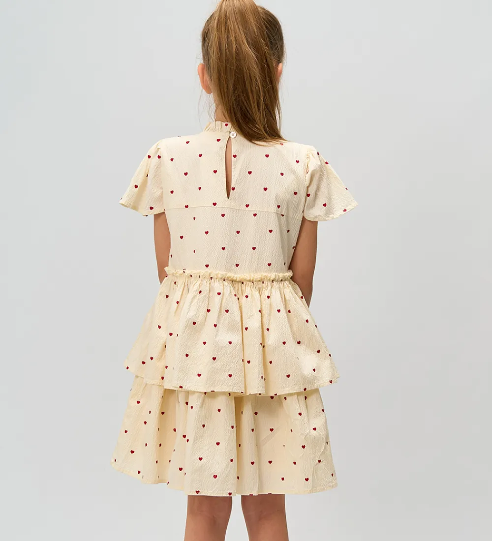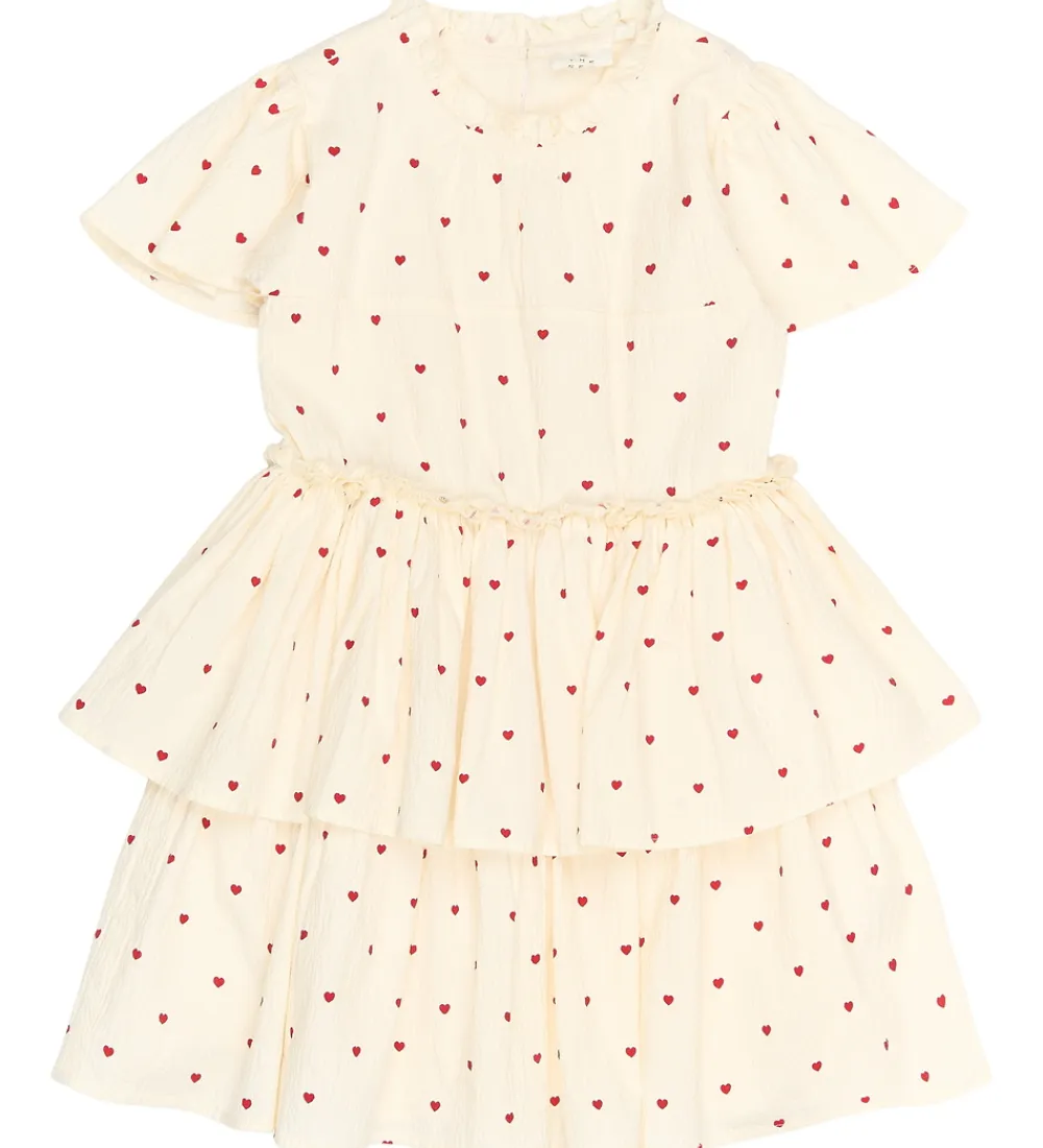 Elegant kjole fra The New i hvid med et sødt mønster af små, røde hjerter. Kjolen fra The New har korte ærmer og fine flæser nederst, hvilket giver et ekstra lag og struktur til designet. Den runde halsudskæring og det bløde materiale gør den til et behageligt valg.