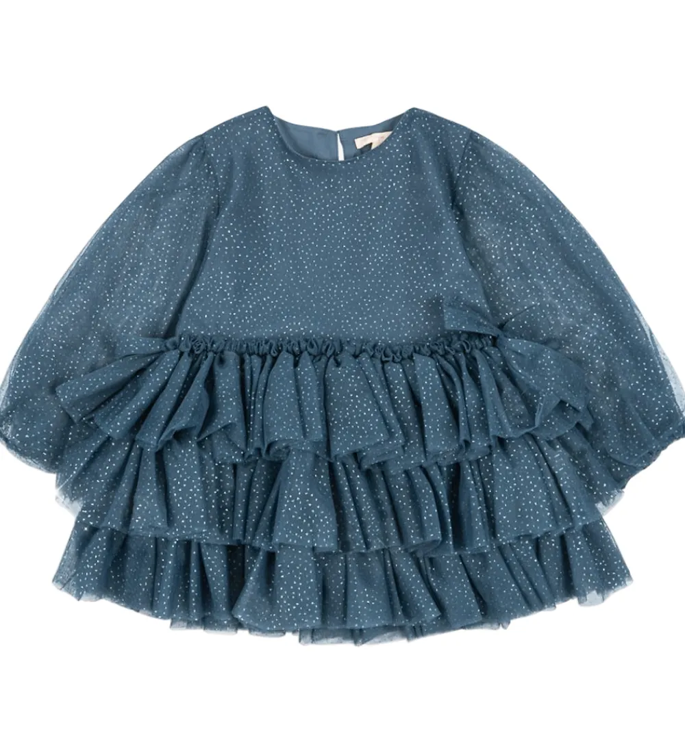 Konges Sløjd kjolen har en fin tylstruktur med voluminøse flæser og lange ærmer. Stoffet er let gennemsigtigt ærmer med en flot, skinnende effekt, som giver kjolen et unikt udtryk.