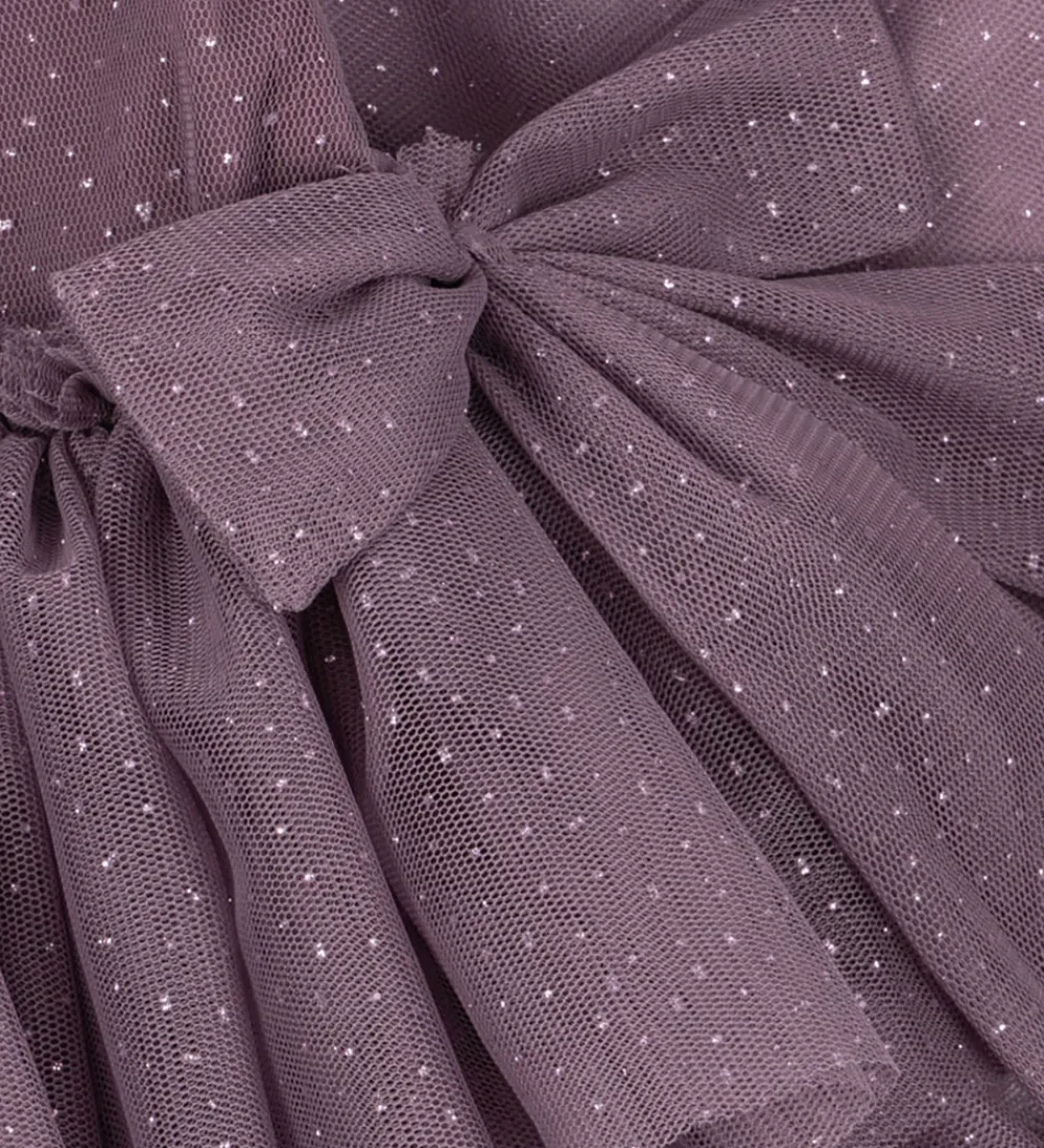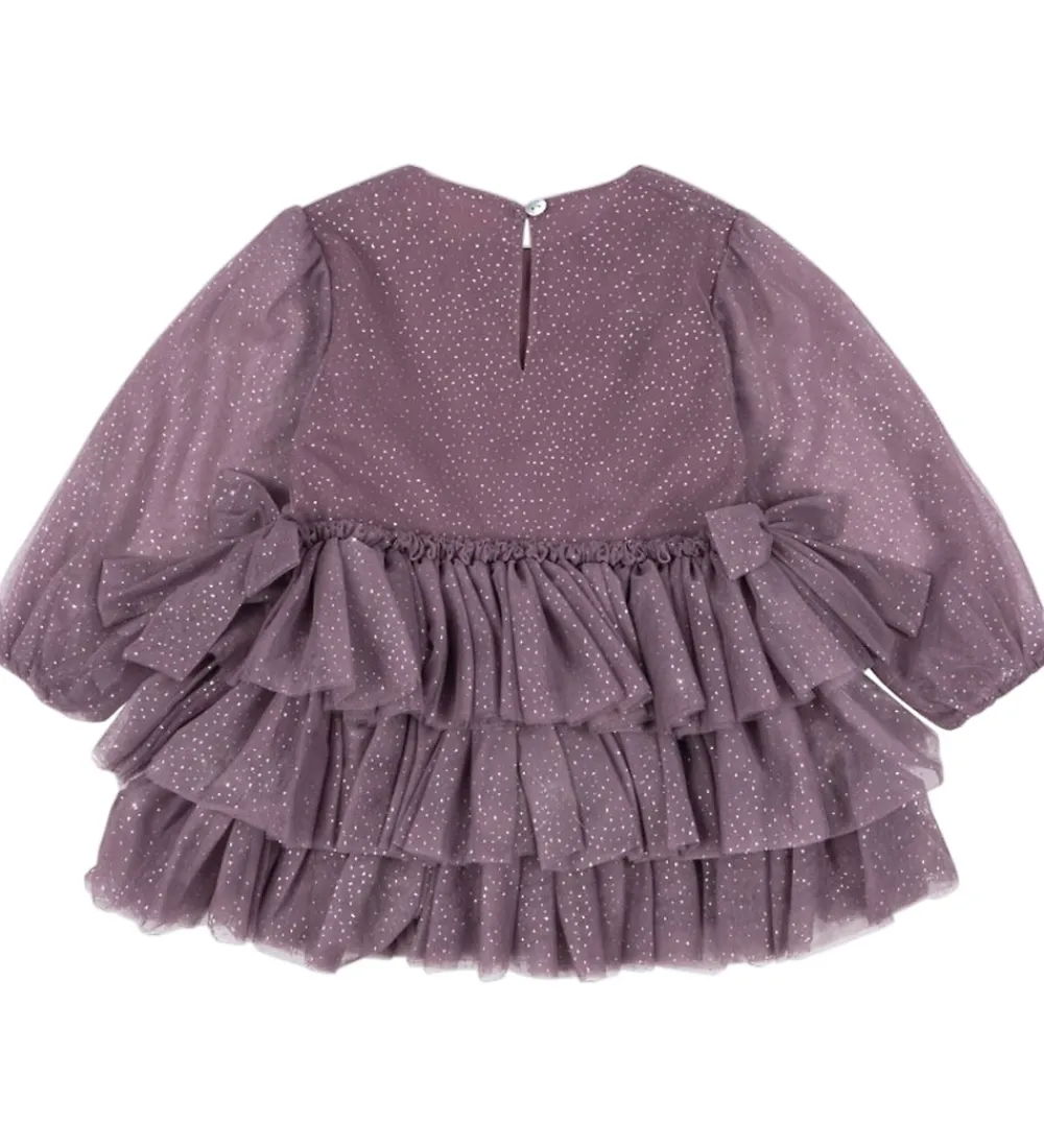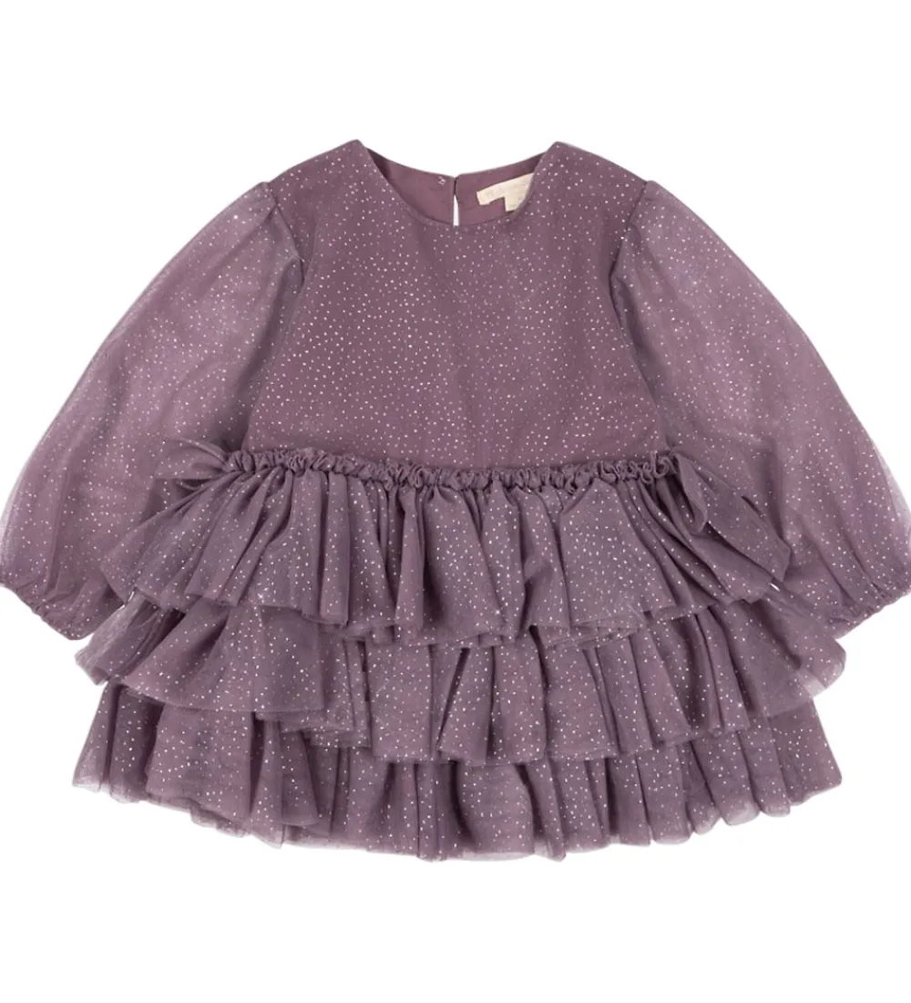 Elegant Konges Sløjd kjole i en flot, lilla nuance med et let strålende mønster af små glimmerprikker. Konges Sløjd kjolen har lange ærmer og en smuk flerlaget tylnederdel med flæser. Stoffet har et diskret, stjernespækket design, der giver en fin glanseffekt.