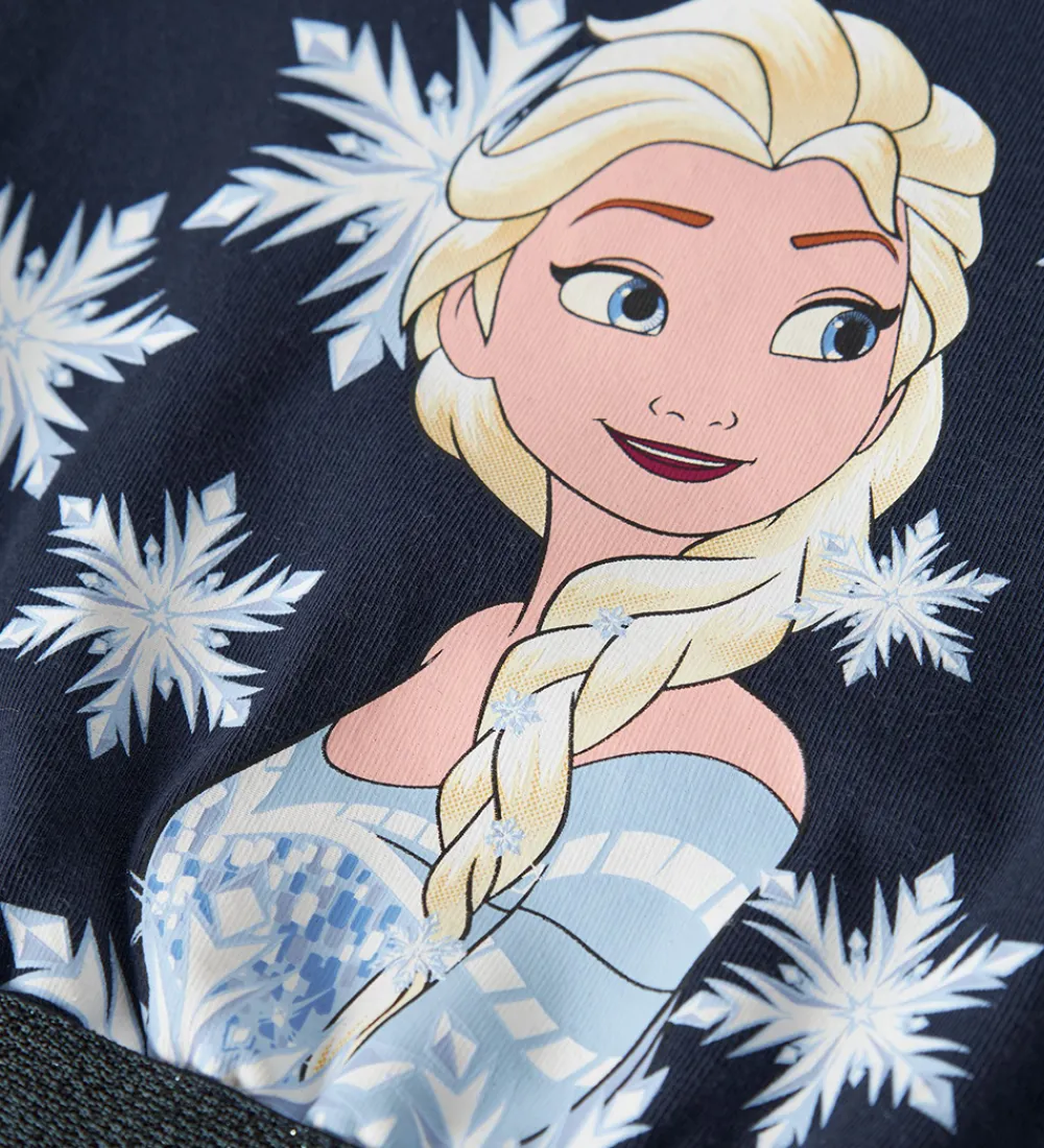 Flot Name It kjole i en mørkeblå farve. Name It kjolen har lange ærmer og et motiv af en kendt karakter fra Frost som er omgivet af snefnug på overdelen. Nederdelen er lavet af et glitrende tylmateriale, der tilføjer et spændende udtryk.