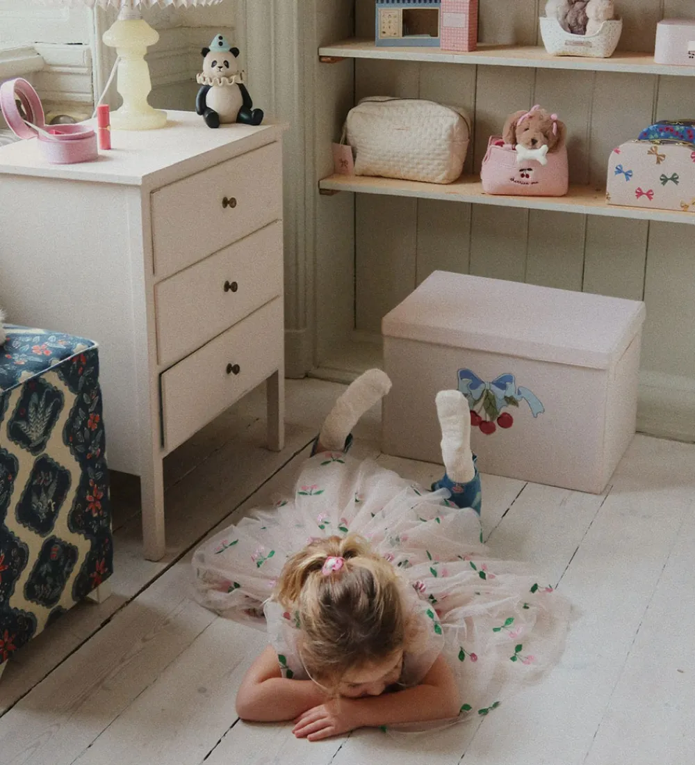 Elegant Konges Sløjd kjole i en sart, lyserød nuance med et charmerende kirsebærprint med glimmer. Kjolen fra Konges Sløjd har korte, puffede ærmer og en smuk overdel med rynkede detaljer. Materialet er let og luftig med en flot tylstruktur.