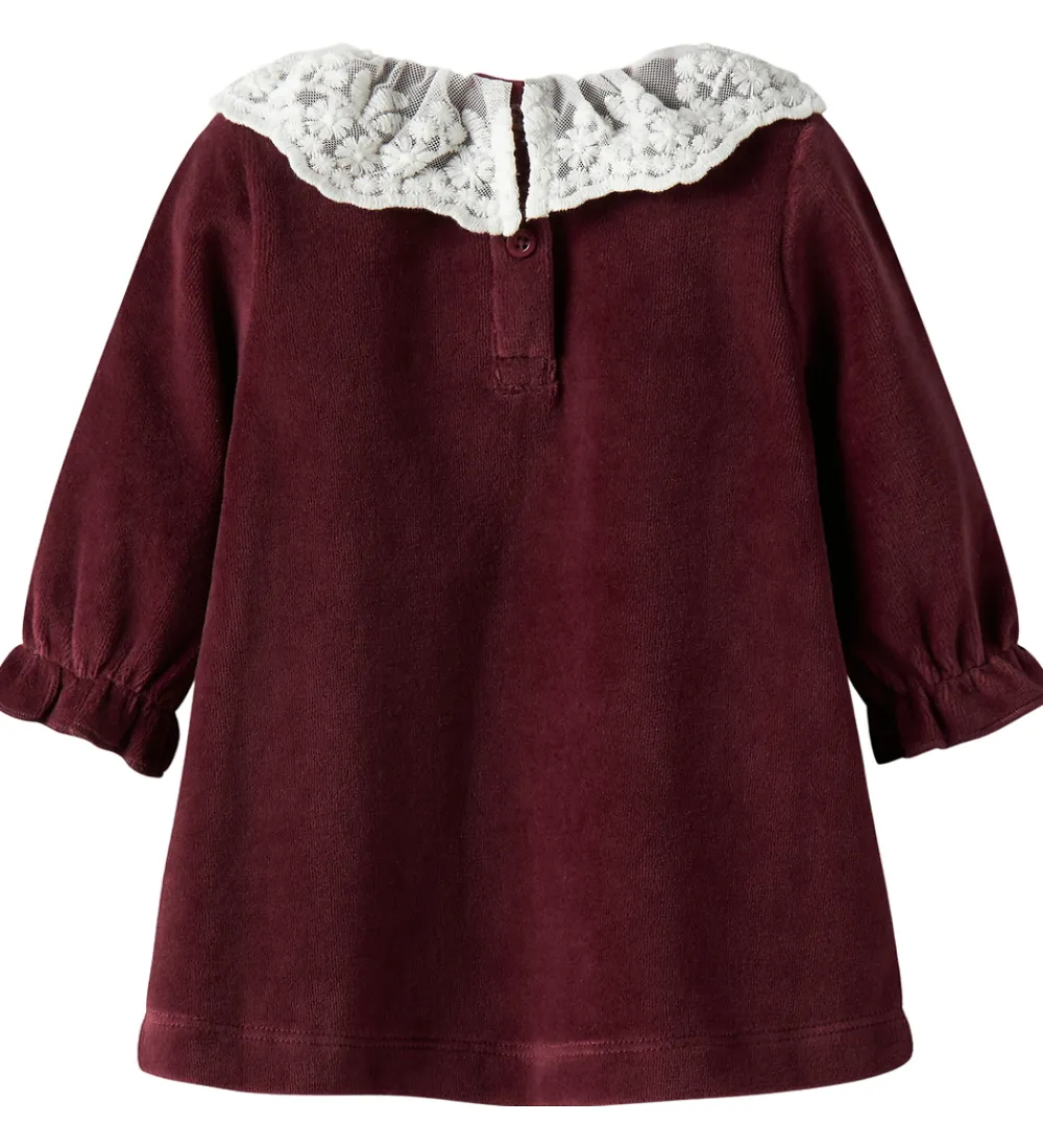 Elegant Name It kjole i mørkerødt velour med en hvid blondekrave i halsen. Kjolen har en rund halsudskæring med knapper i nakken. Den har lange ærmer med flæseafslutning ved håndleddene.