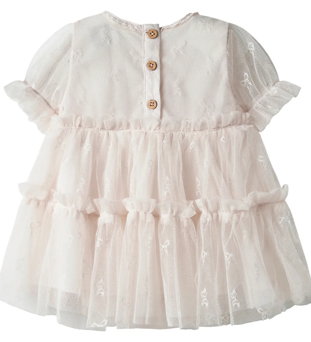 Elegant Lil Atelier kjolebody i lyserosa med et lagdelt tyl-design, fine flæser og korte pufærmer. Stoffet er let gennemsigtigt med delikate sløjfemønstre, der tilføjer et sofistikeret udtryk. Øverst afsluttes kjolebodyen med en enkel, rund halsudskæring og lukkes praktisk mellem benene med trykknapper.