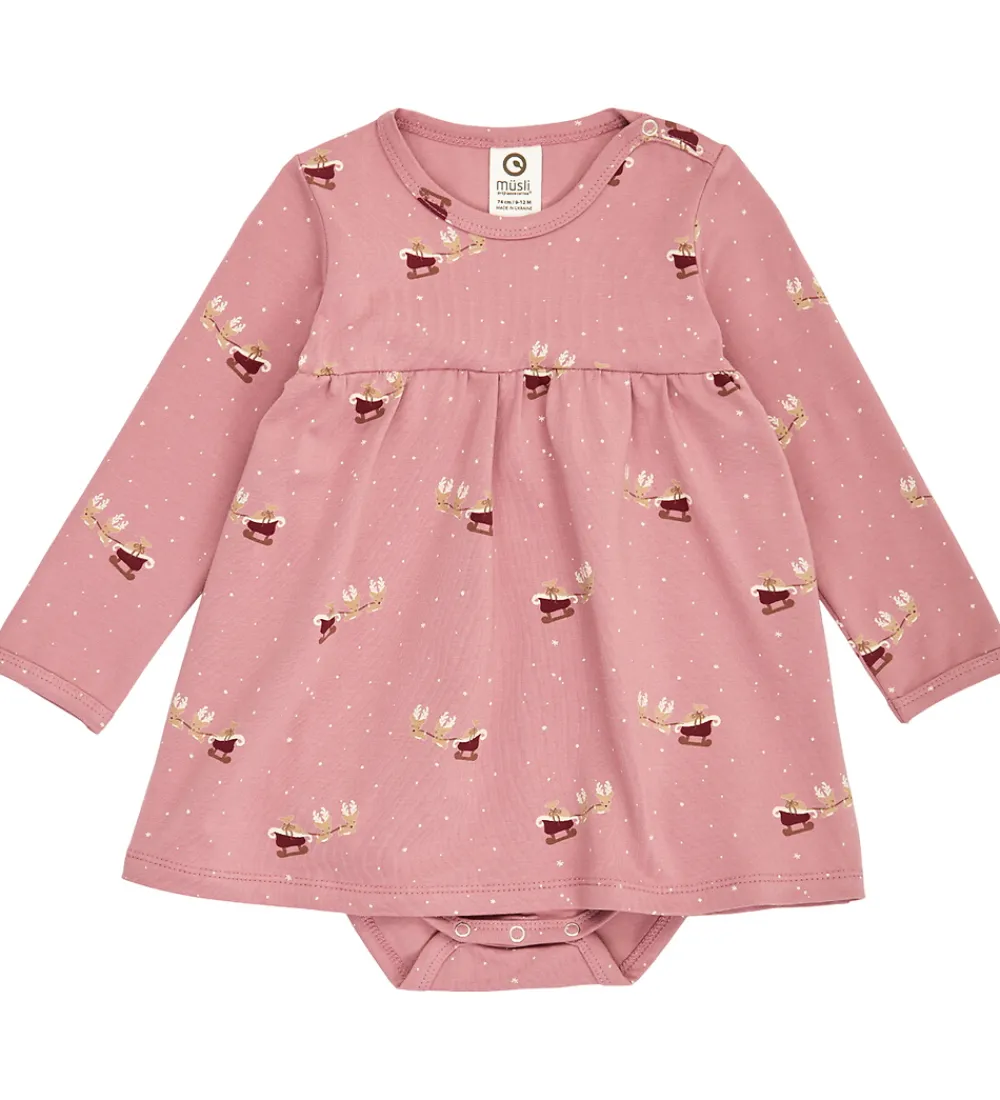 Charmerende Müsli kjolebody i en varm rosa nuance dekoreret med et sødt julemandsprint og små prikker. Müsli kjolebodyen har lange ærmer og rund hals med en praktisk trykknap ved venstre skulder. Bodyen har et langt skørt, så den ligner en kjole, og mellem benene lukkes den med trykknapper.