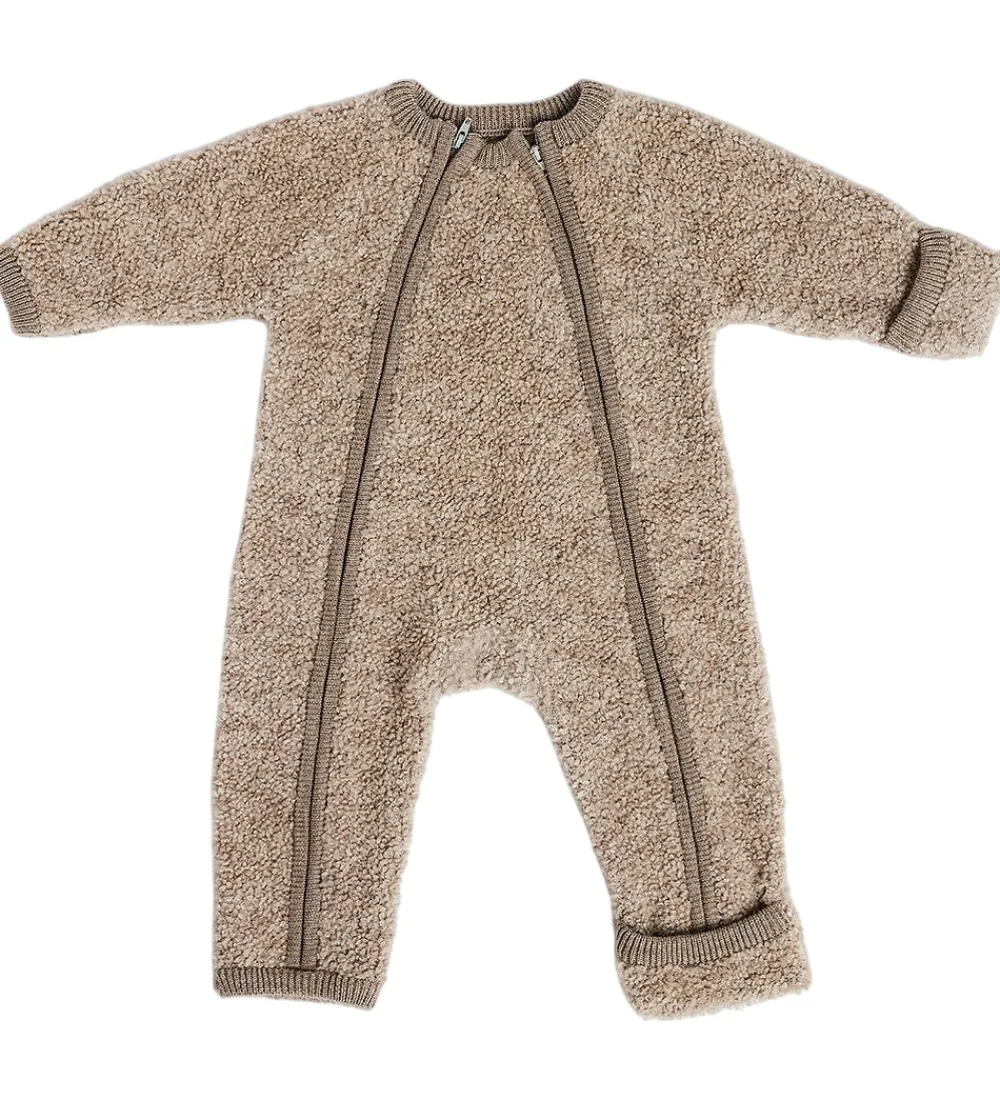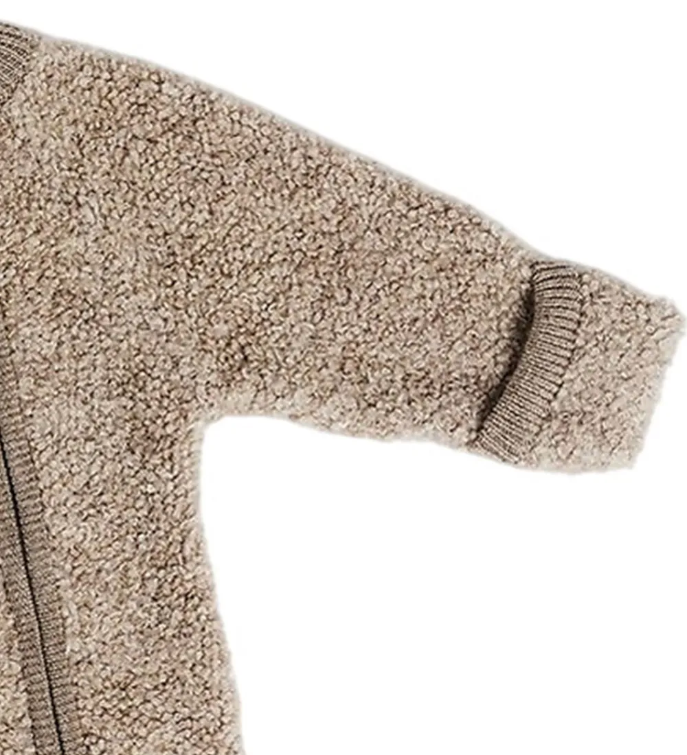 Praktisk Smallstuff køredragt i beige bouclé. Køredragten åbnes fortil med to lynlåse fra hagen til knæene. Den har lange ærmer og lange ben med mulighed for ombuk til lukkede hænder og fødder. Køredragten har ribkanter ved alle åbninger. Den er fremstillet af merinould og polyamid for varm og holdbar kvalitet.