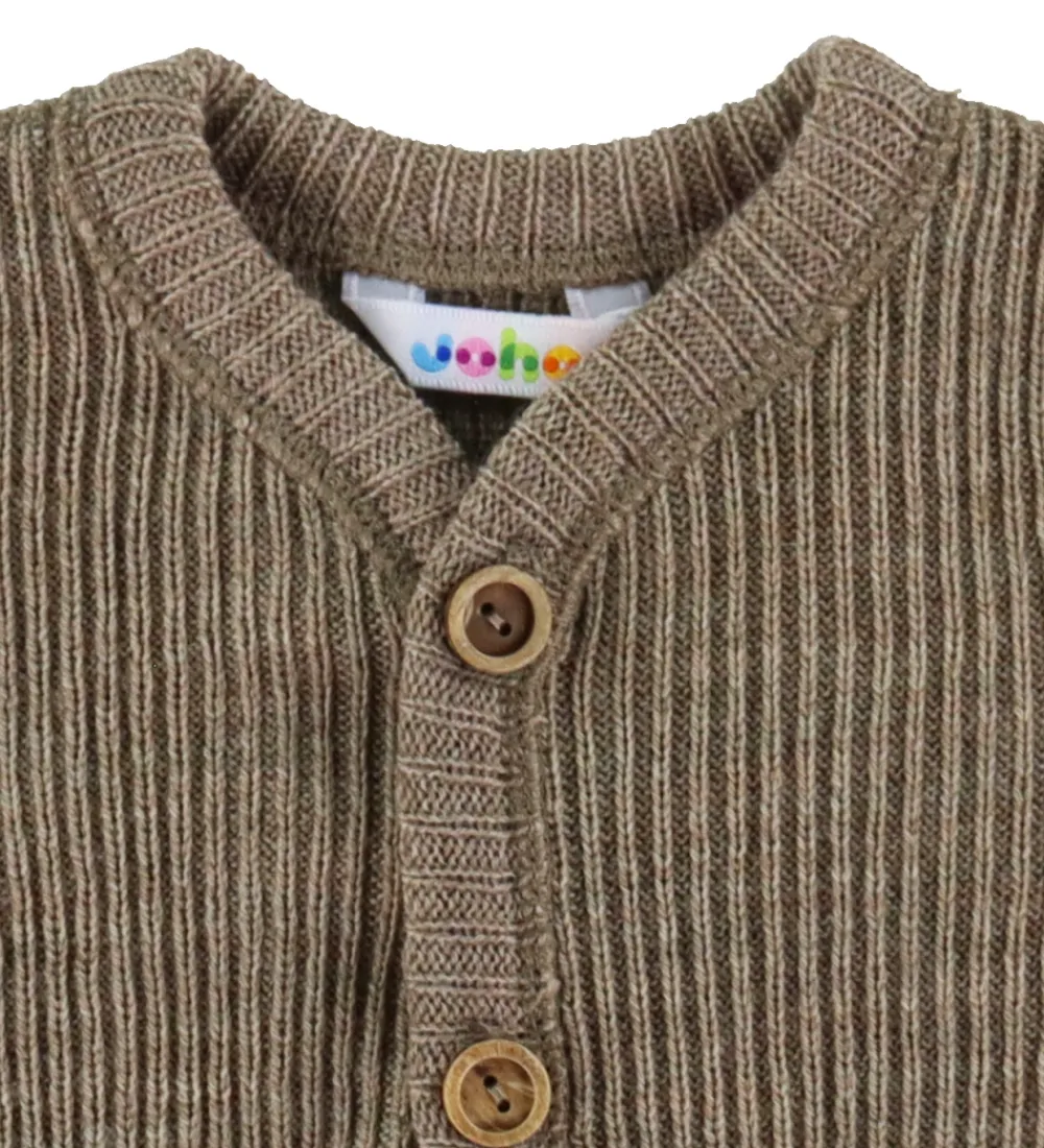 Skøn Joha køredragt i beige med ribstruktur. Køredragten har knapper foran. Den har lange ærmer og lange ben med brede ribkanter. Køredragten er fremstillet af merinould.