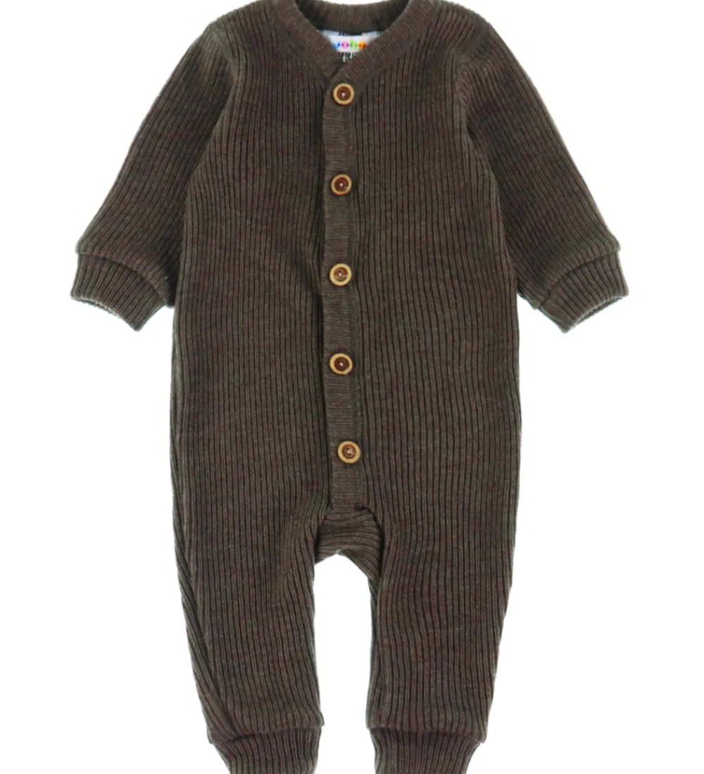 Lækker Joha køredragt i mørkebrun med ribstruktur. Køredragten har knapper foran. Den har lange ærmer og lange ben med brede ribkanter. Køredragten er fremstillet af merinould.