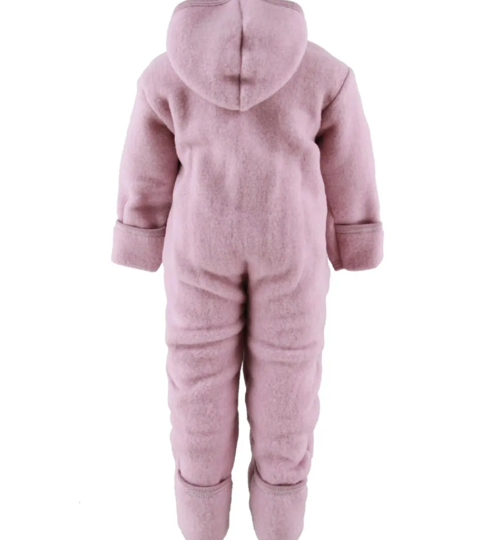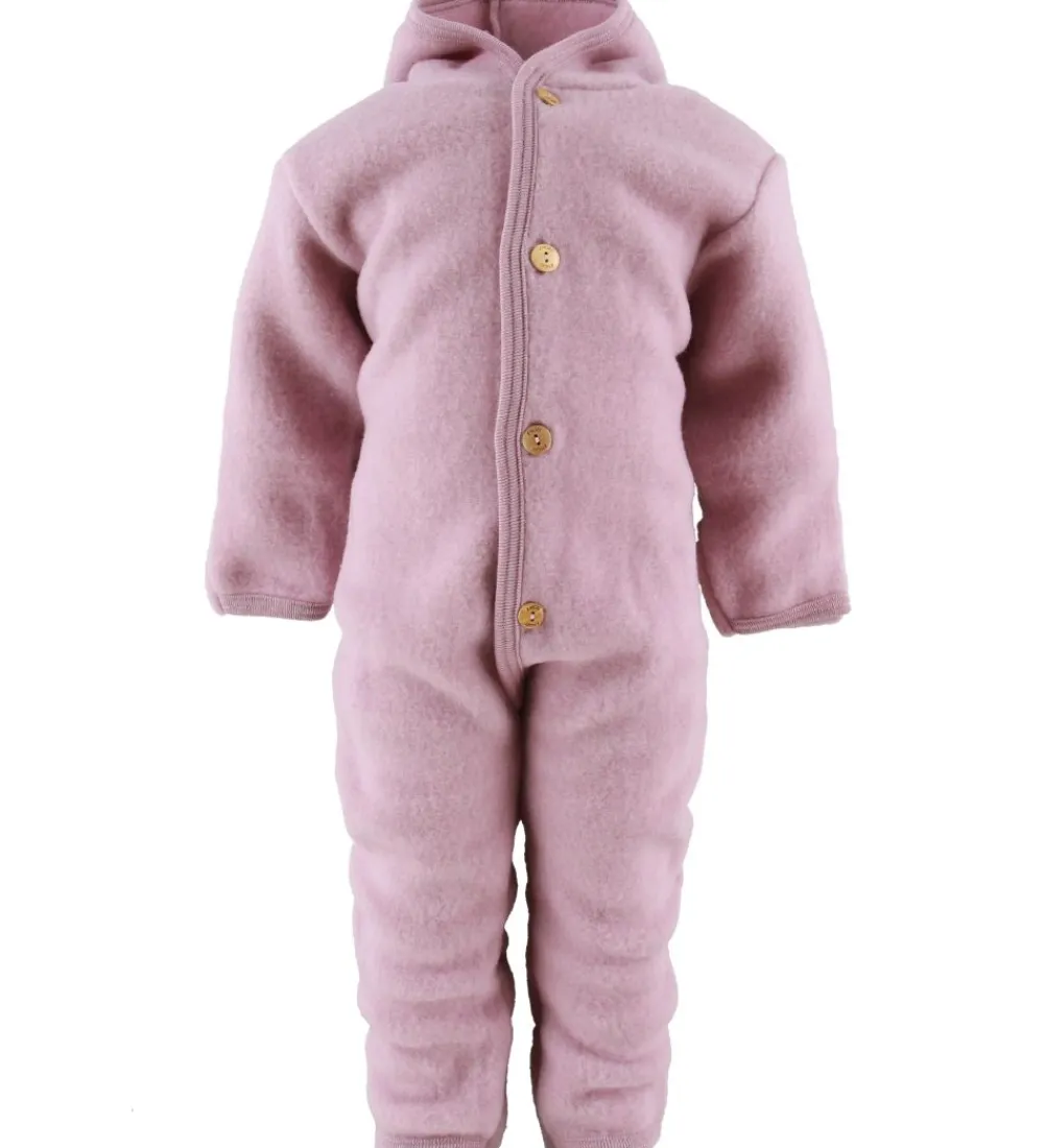 Engel køredragten har en fast hætte og en gennemgående knappeåbning med fine træknapper. Den har lange ærmer og ben, der er kantet med en blød ribkant. Dragten har praktiske ombuk ved hænder og fødder.
