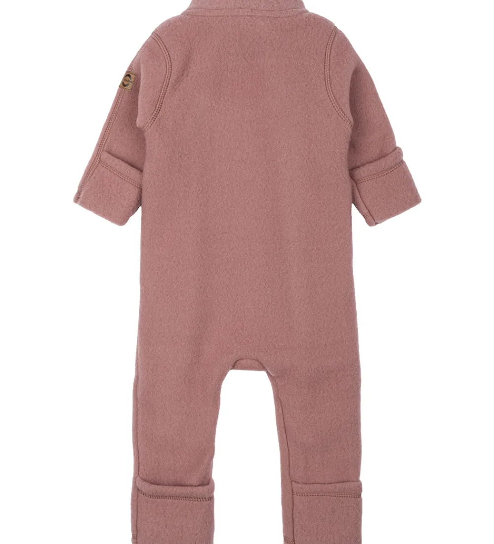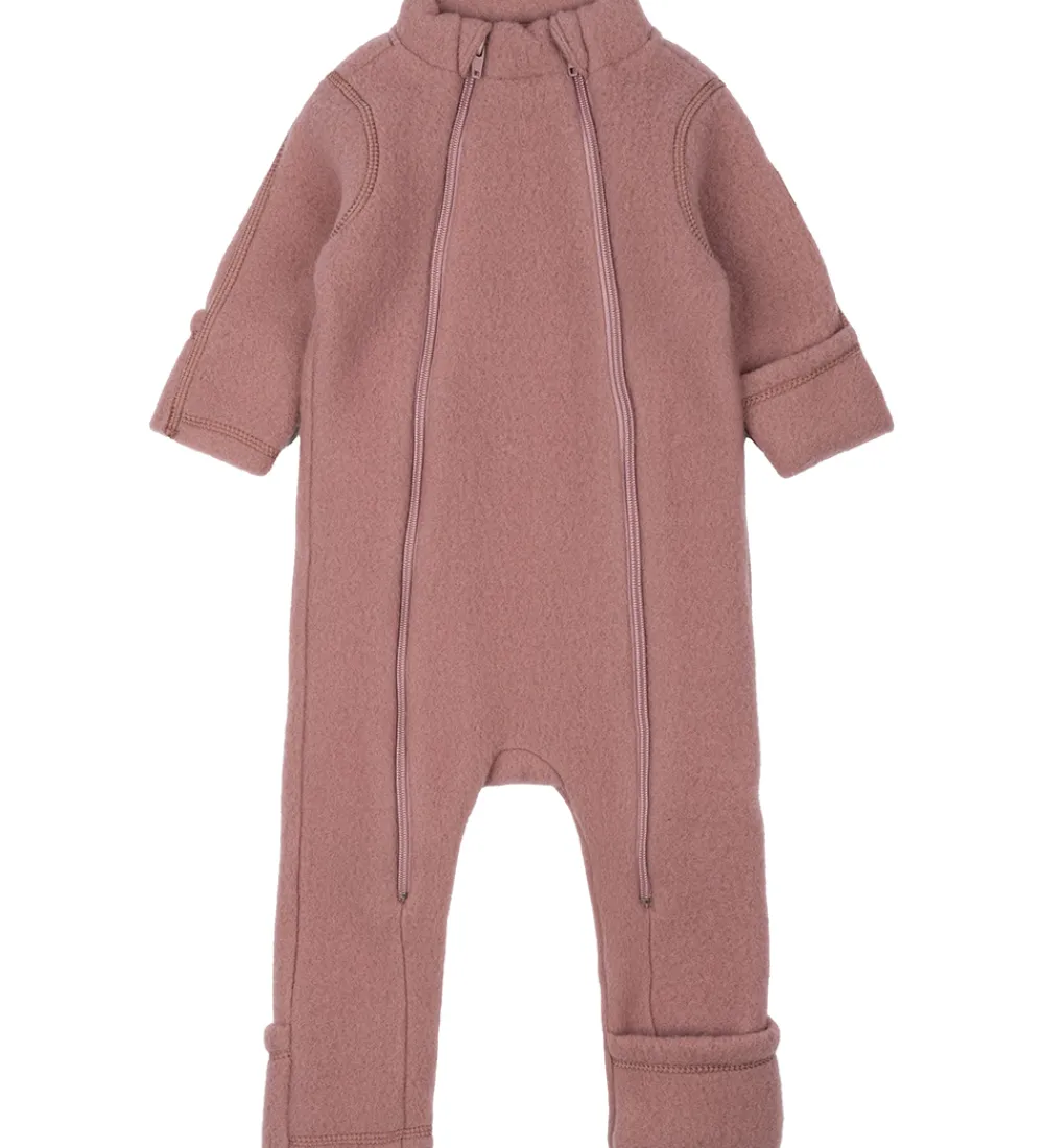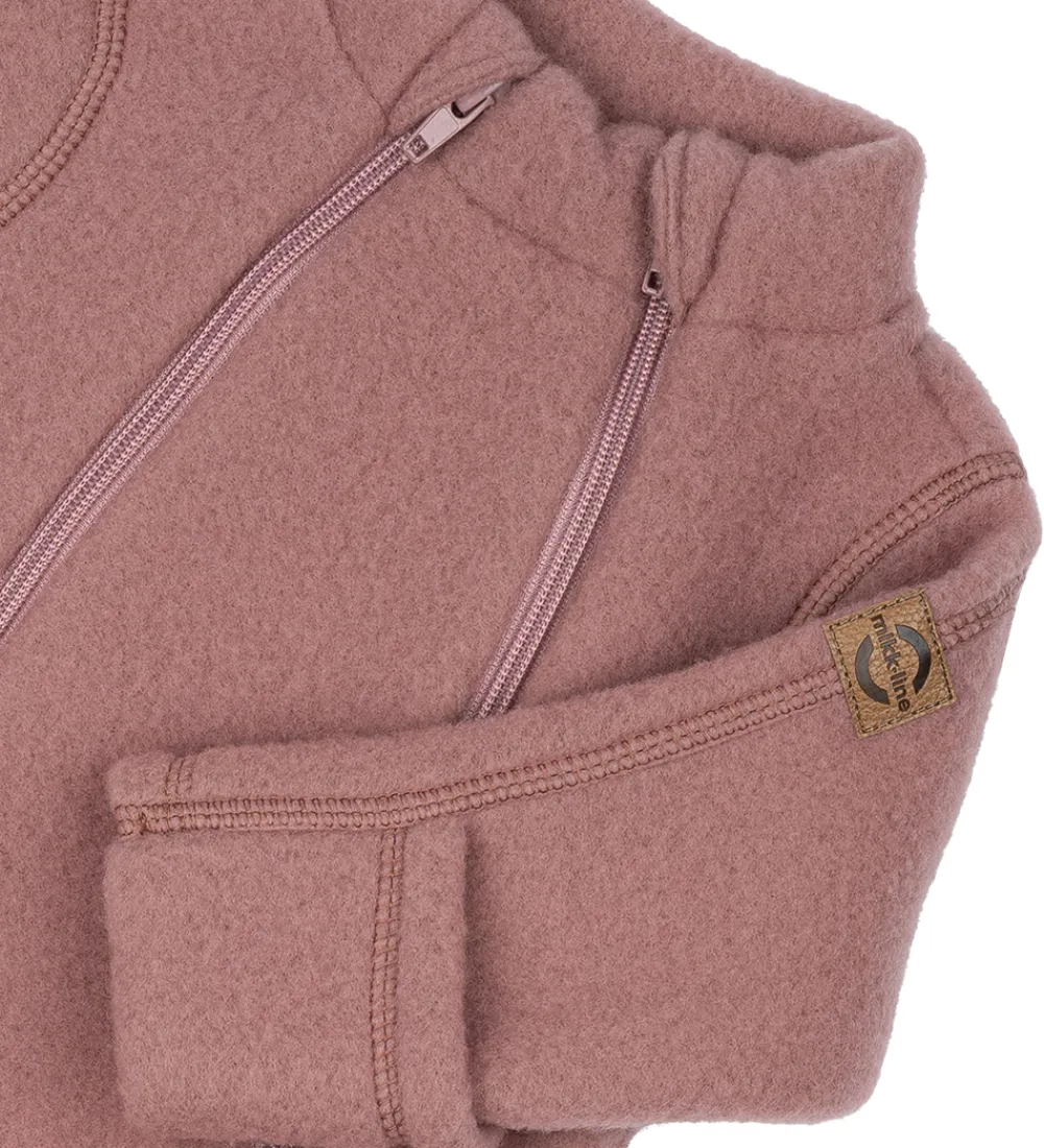 Lækker Mikk-Line køredragt af filtet uld i støvet rosa med et lille, brunt logo på venstre ærme.