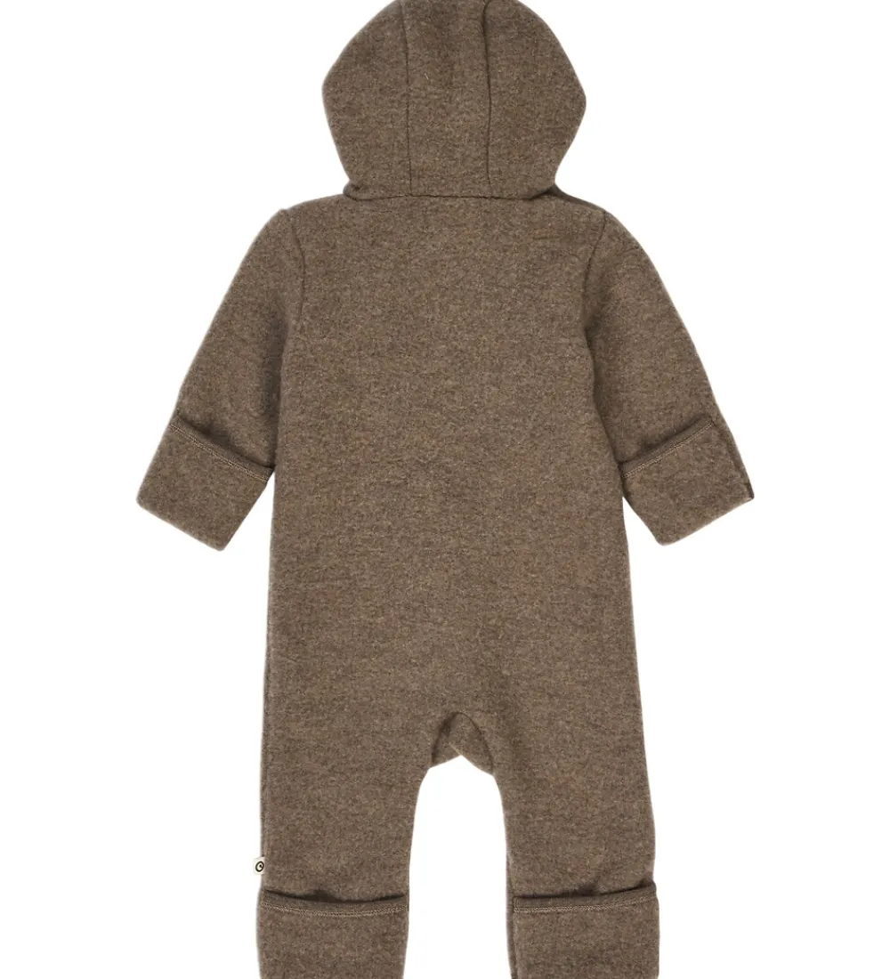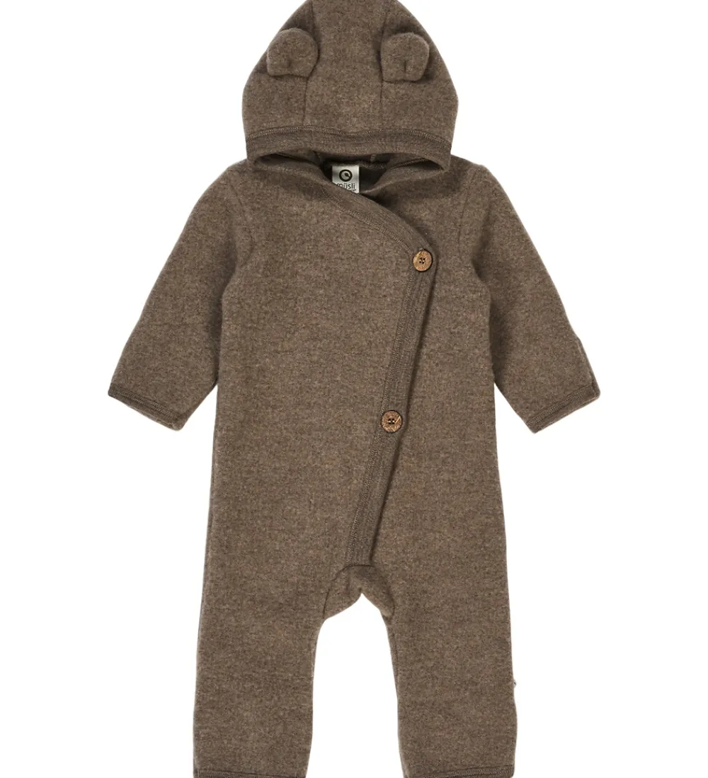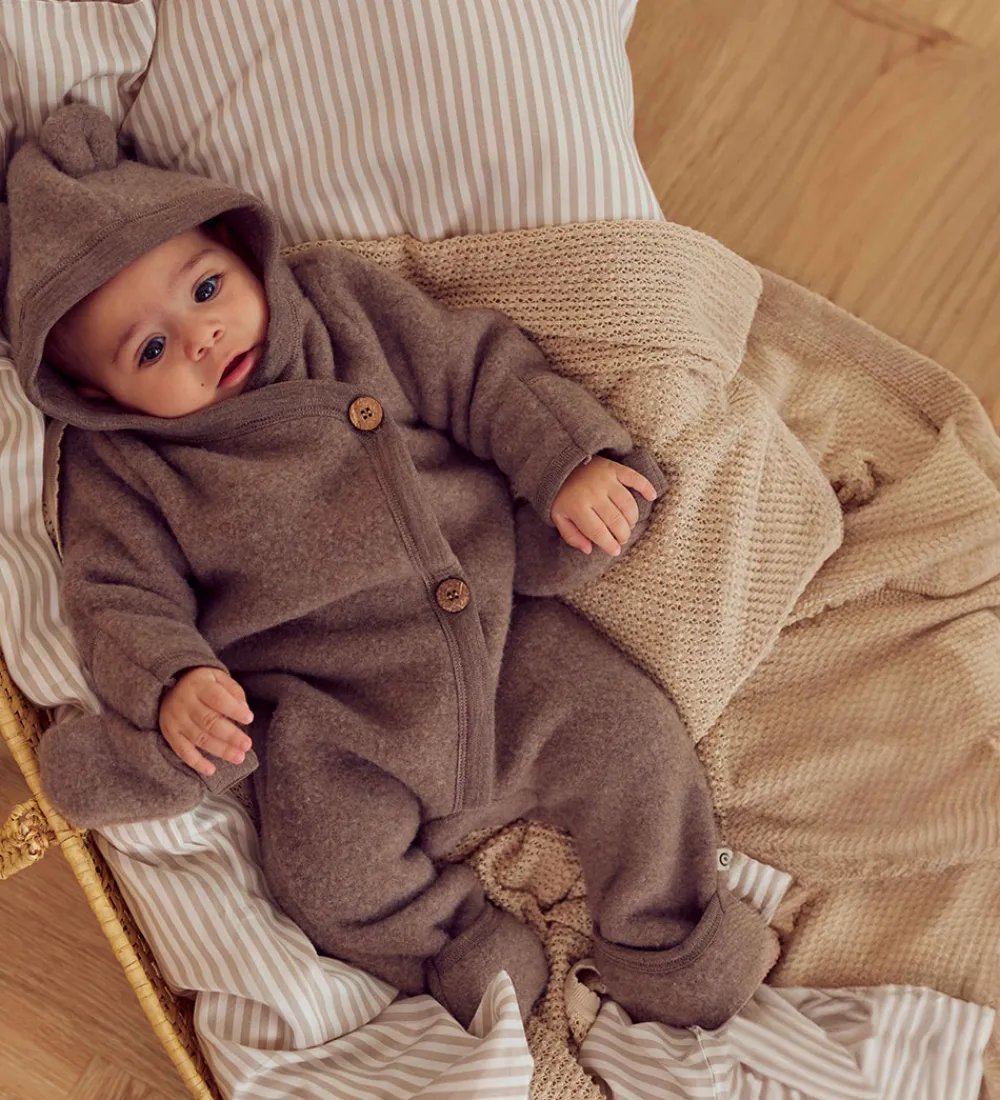 Müsli køredragten har en fast hætte med søde ører, og den har lange ærmer og ben med smalle ribkanter og praktiske ombuk. Køredragten åbne med knapper fortil, og den er lavet af skønt, økologisk merinould.