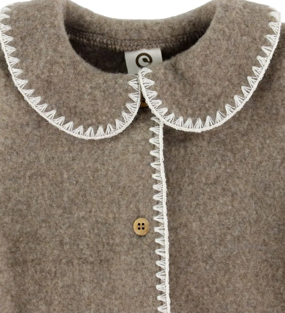 Elegant Müsli køredragt af uldfleece i en ensartet, meleret brun farve med dekorative syninger langs kanterne.