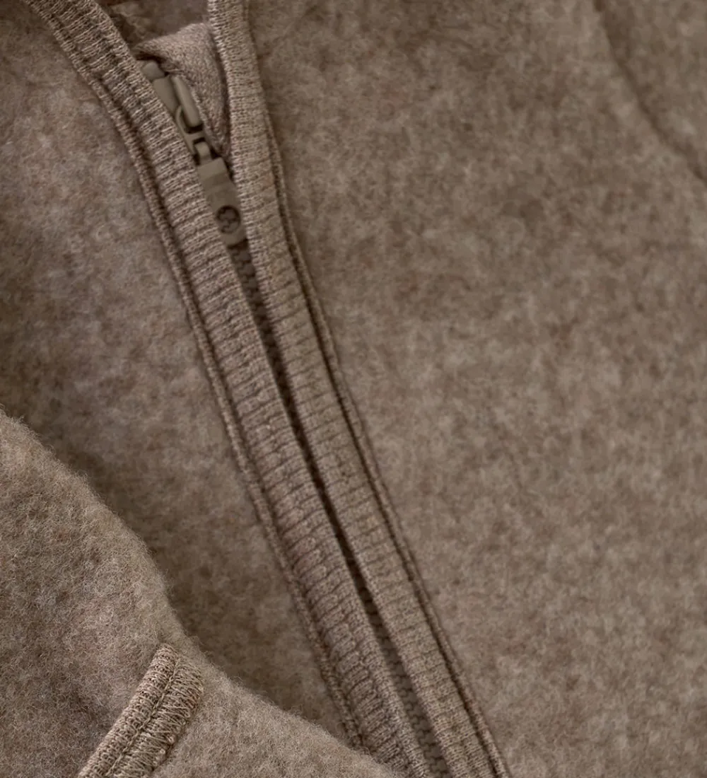 Lækker Huttelihut køredragt i meleret, mørkebeige uldfleece.