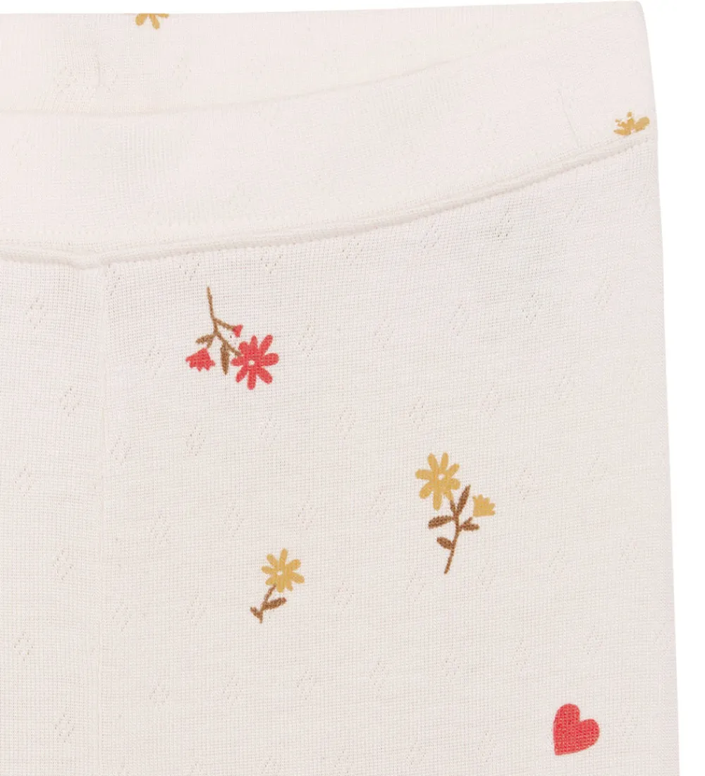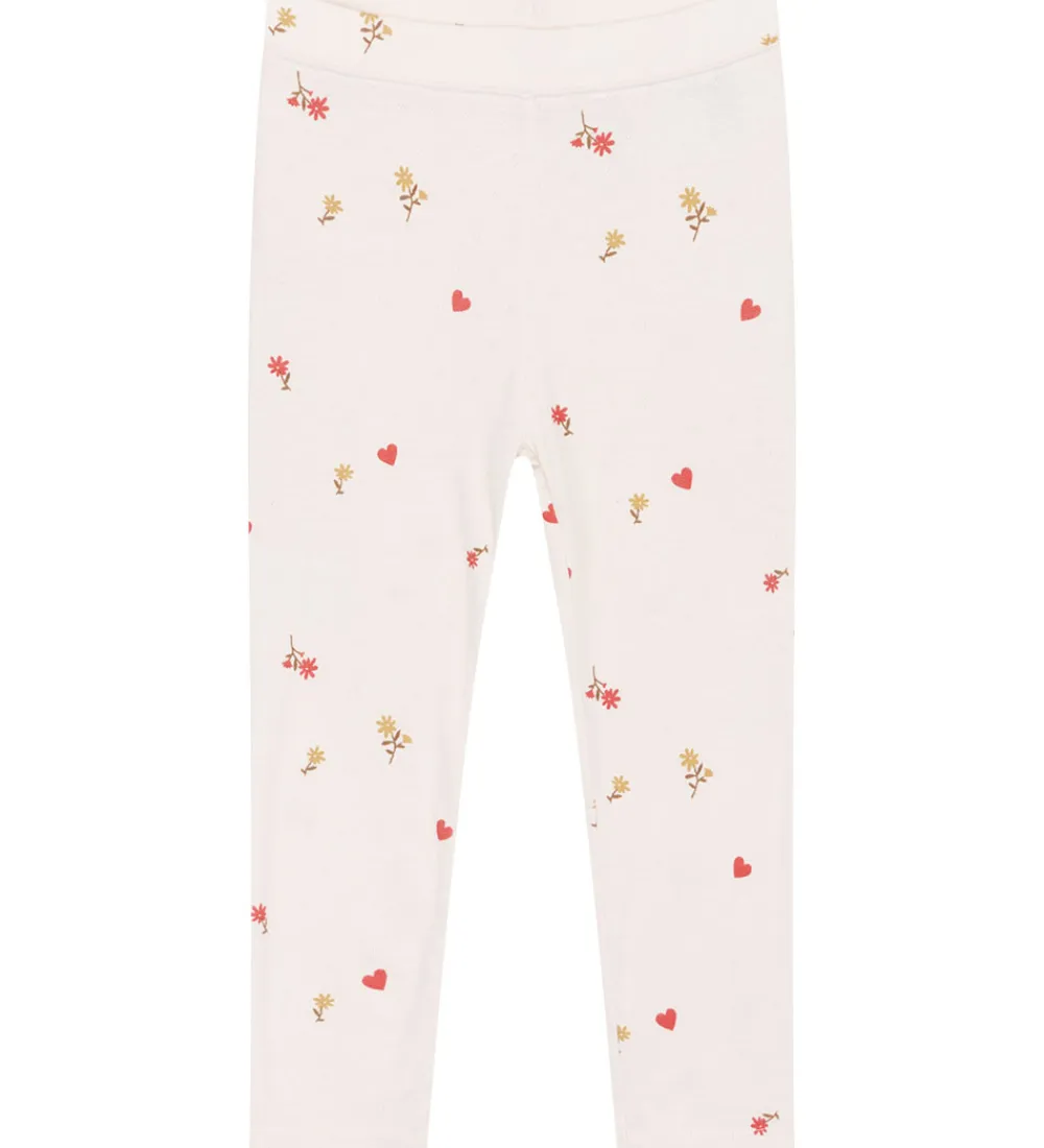 Charmerende Hust and Claire leggings i en lys cremefarve med små, spredte motiver af røde hjerter og farverige blomster. Hust and Claire leggingsene har en elastisk kant i livet, der sikrer en behagelig pasform.