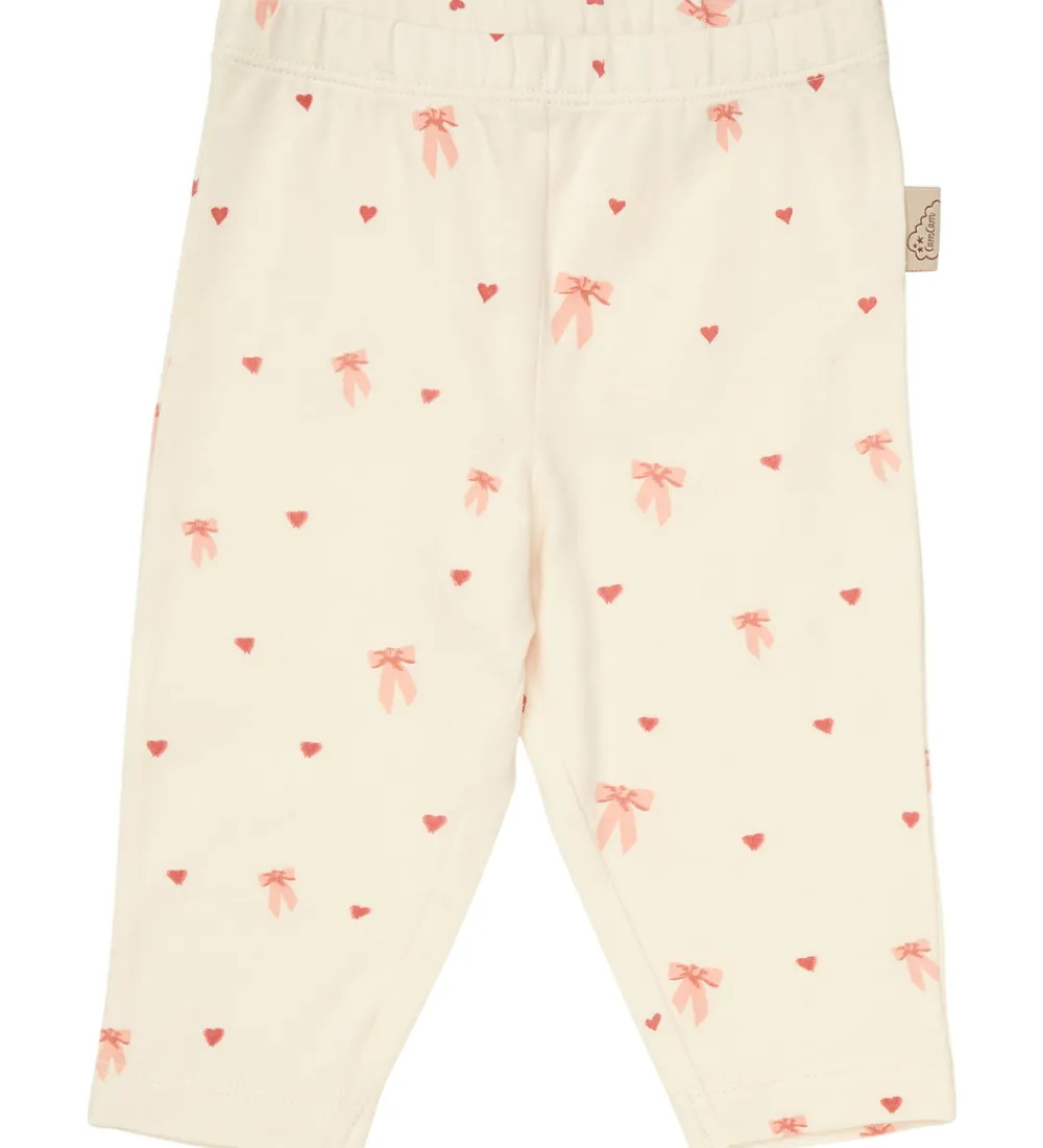 Søde Cam Cam leggings i lys rosa med print af rosa sløjfer og røde hjerter. Cam Cam leggingsene har en behagelig elastisk talje, der sikrer en god pasform.