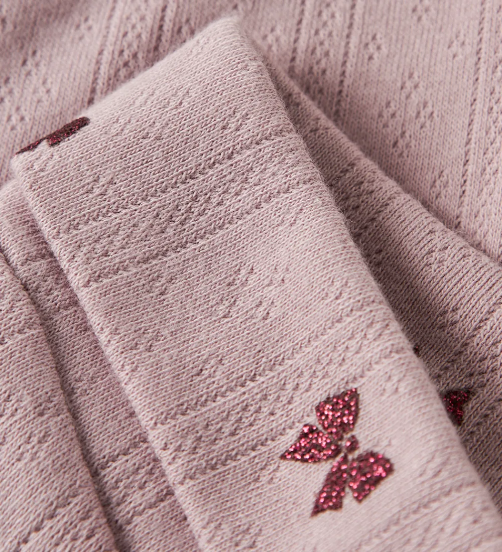 Fine Name It leggings i en sart rosa nuance med små, skinnende sløjfer i mørkerød samt et diskret hulmønster. Name It leggingsene har en elastisk kant i livet, som bukkes om.