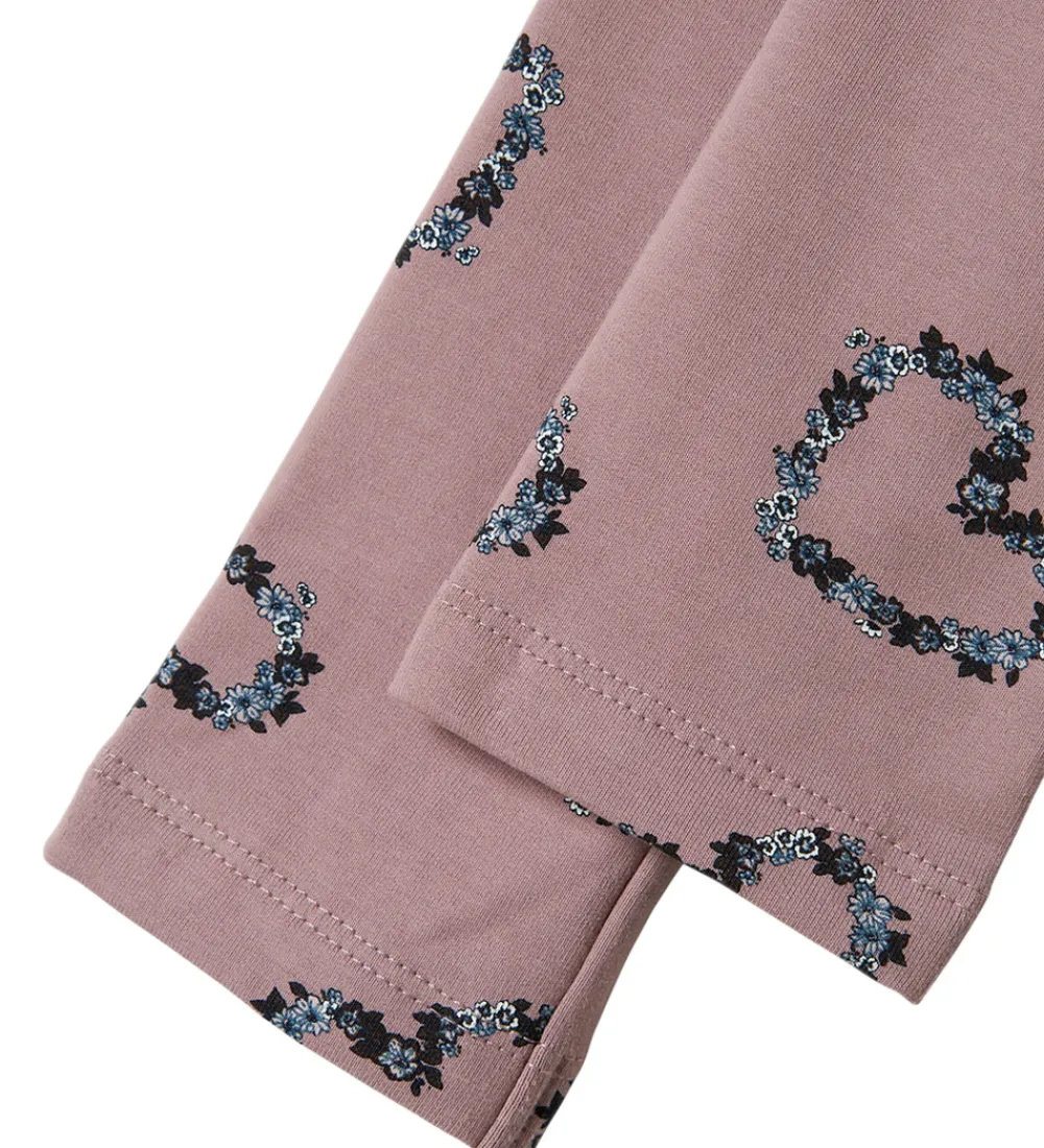 Indbydende Name It leggings i støvet lilla sweat med et print af hjerter lavet af blomsterranker i hvid og lilla nuancer. Leggingsene har lange ben, og i livet er der en smal elastikkant. Leggingsene har blødt, børstet bomuld på indersiden.