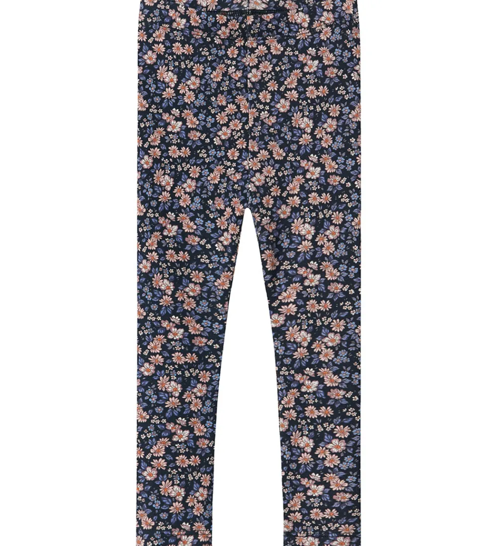 Smukke Name It leggings i navyblå med et detaljeret blomstermønster i rosa og lilla nuancer. Name It leggingsene har en elastisk talje, der sikrer en god pasform.
