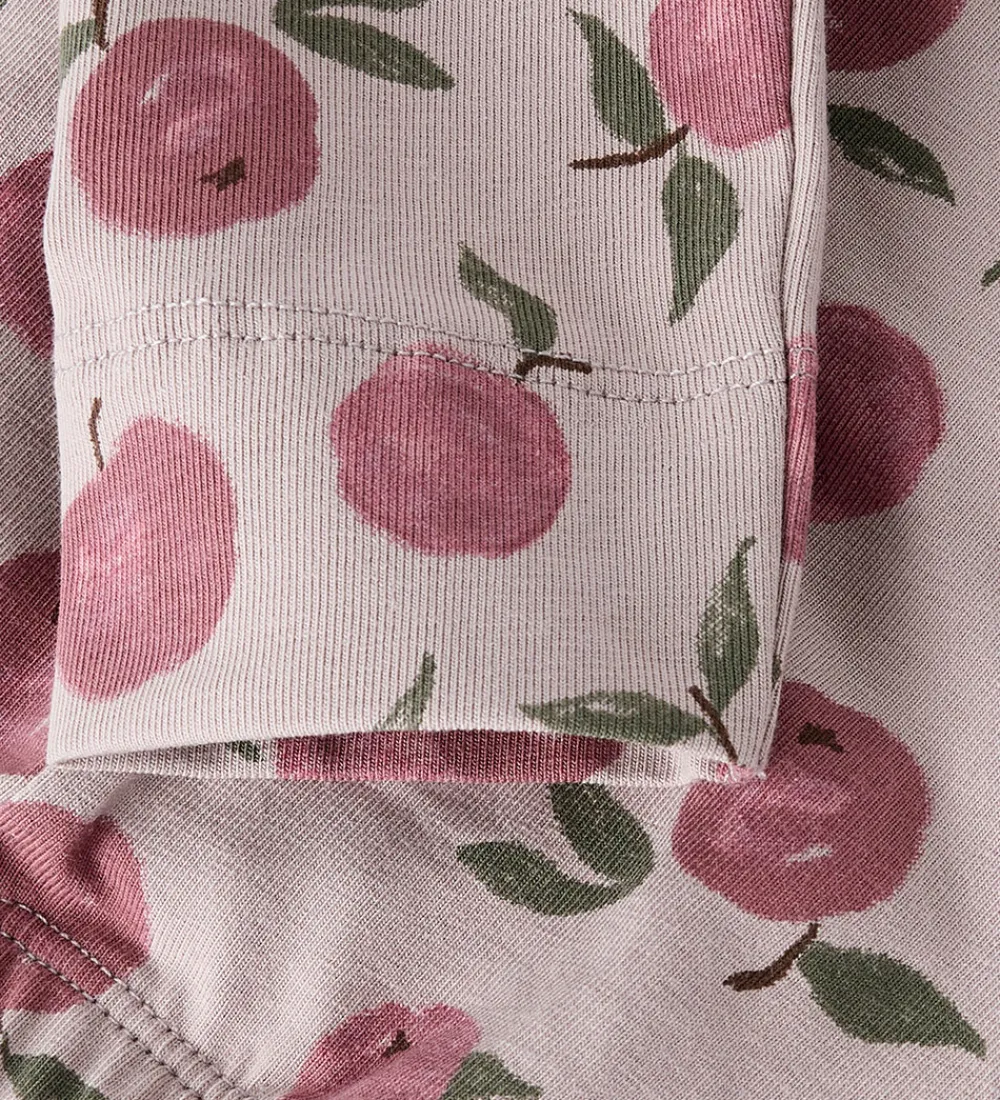 Fine Name It leggings i støvet lyselilla med et alloverprint af frugter i rosa og grønne nuancer. Name It leggingsene har en elastisk talje og brede kanter ved anklerne, der sikrer en behagelig pasform.