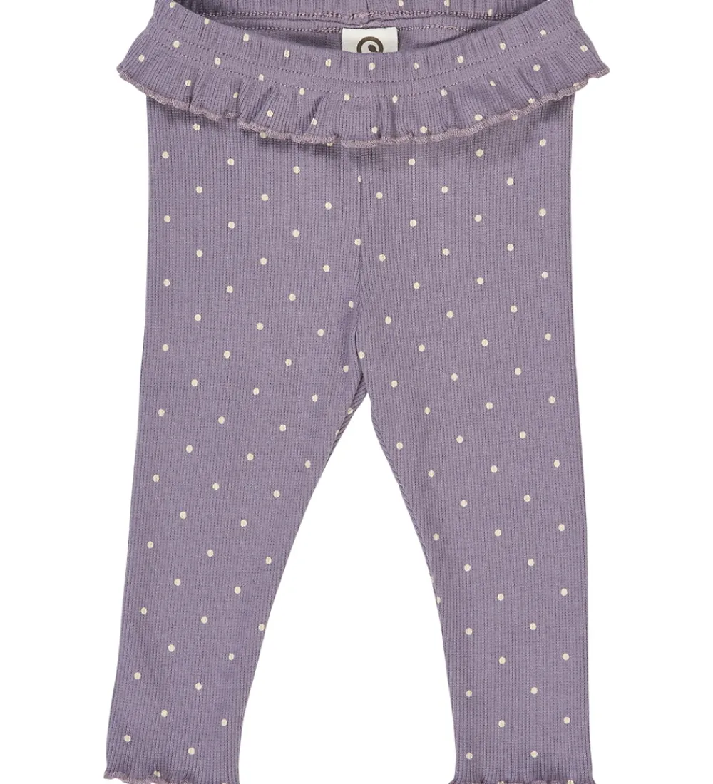 Charmerende Müsli leggings i en lilla nuance med små, beige prikker og en lækker ribstruktur. Müsli leggingsene har en elastisk talje med en dekorativ flæsekant.