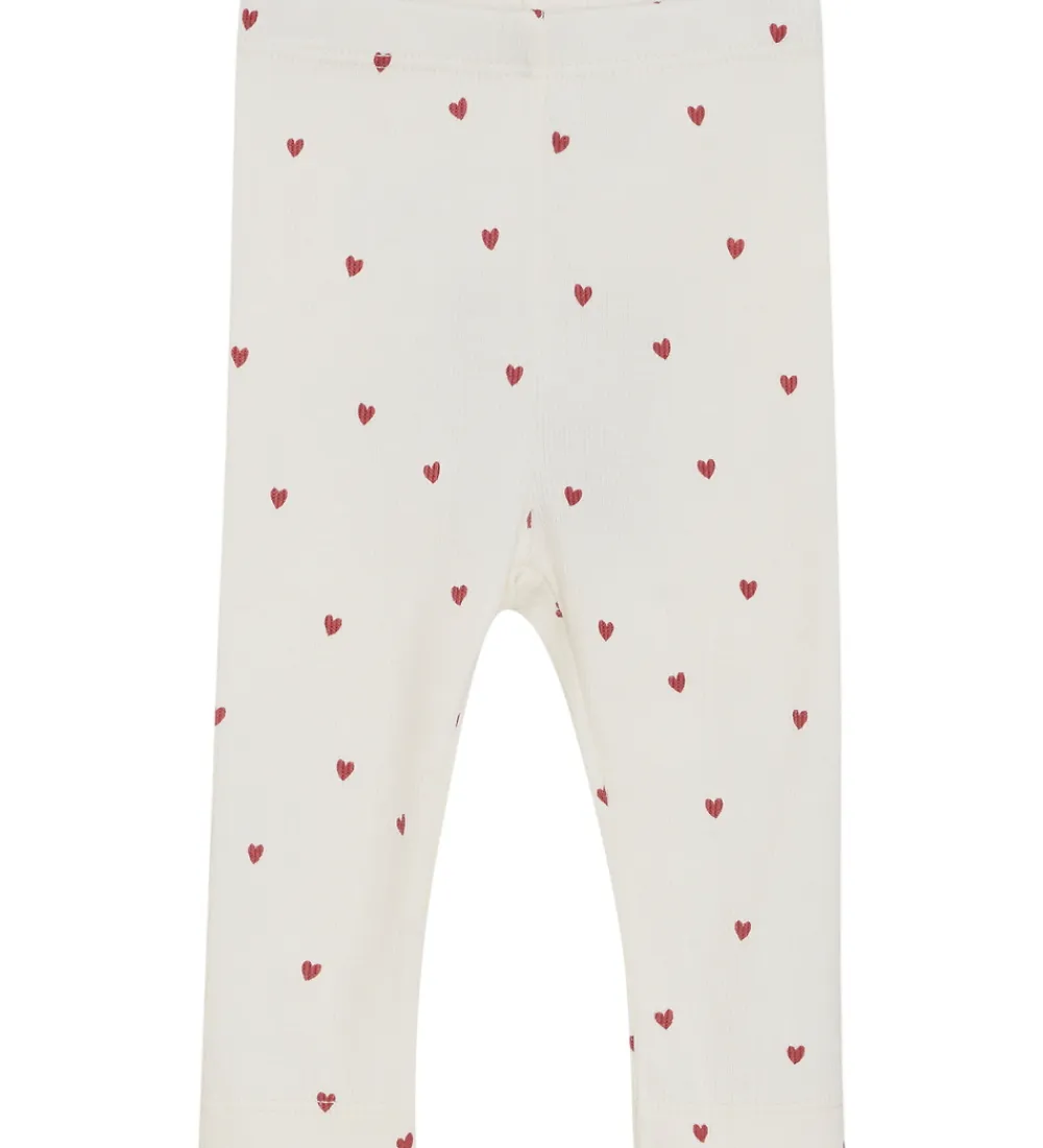 Charmerende Minymo leggings i hvid med små røde hjerter overalt og med en flot ribstruktur. Minymo leggingsene har en elastisk talje, der sikrer en behagelig pasform.