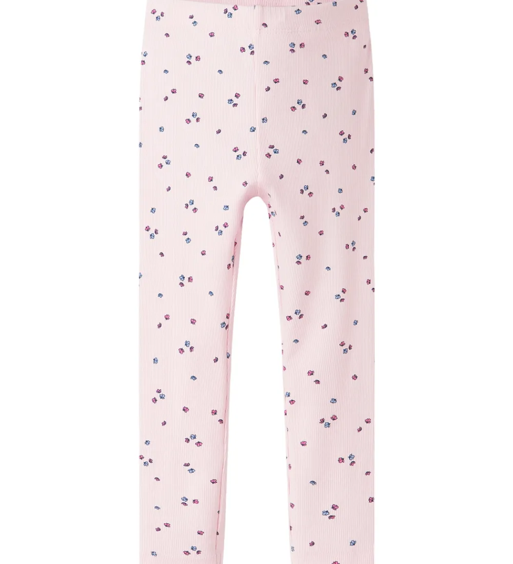 Elegante Name It leggings i en lys, rosa farve med et delikat blomstermønster i pink og blå nuancer. Name It leggings har en elastisk talje og en blød ribstruktur, der giver en behagelig pasform.