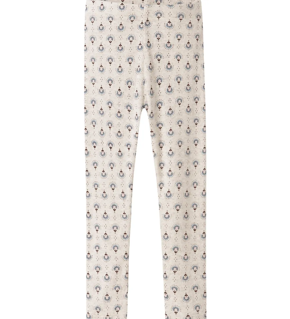Fine Name It leggings i en lys cremefarve med et blomsterlignende mønster i blå, brun og rosa. Name It leggingsene har ribstruktur og en elastisk talje, som giver en god pasform.