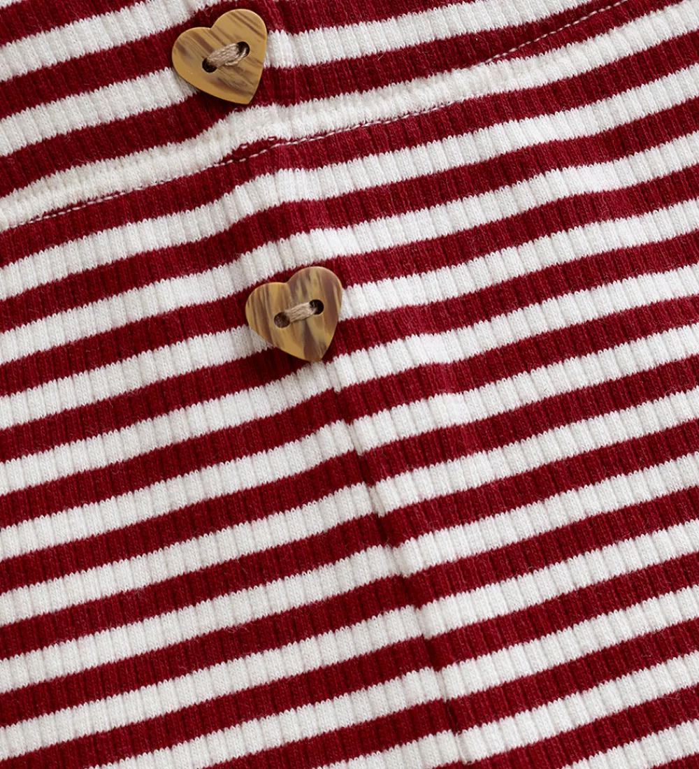 Stilfulde Minymo leggings med vandrette striber i rød og hvid. Leggingsene har ribstruktur og to hjerteformede knapper fortil. De har en behagelig pasform og bølgede kanter i benåbningerne.