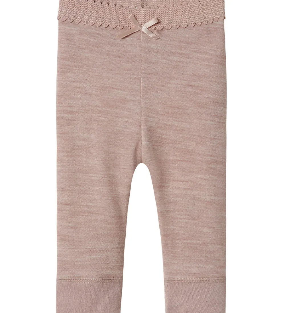 Søde Name It leggings i meleret rosa med en dekorativ sløjfe foran. Leggingsene har en elastik med blonde i taljen og ribkanter ved anklerne. De er fremstillet af merinould og viskose.