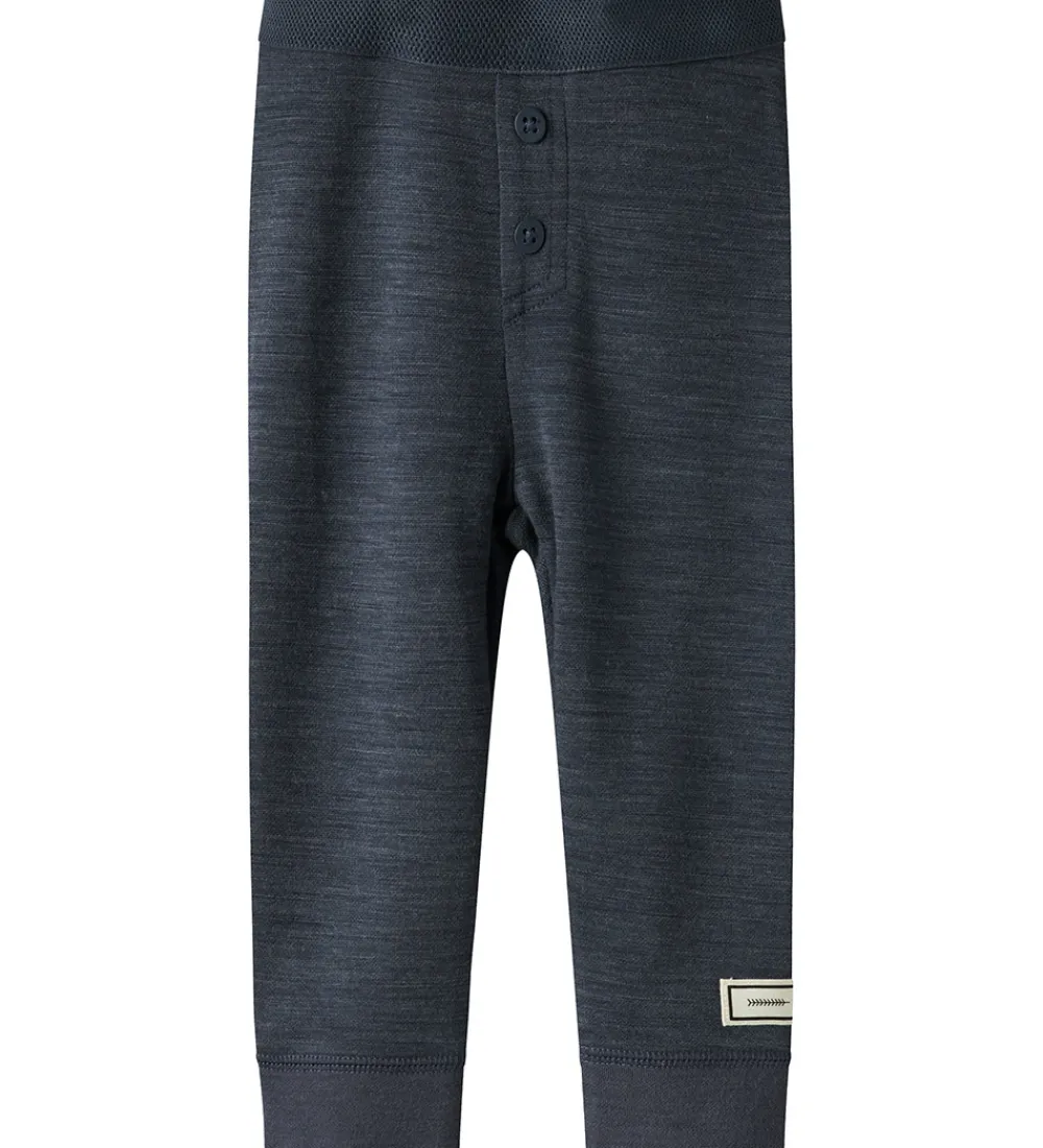 Smarte Name It leggings i meleret mørkeblå med en hvid applikation nederst på venstre ben. Name It leggingsene har en elastisk talje med dekorative knapper fortil og ribkanter ved anklerne. Legginsene er fremstillet af merinould og viskose.