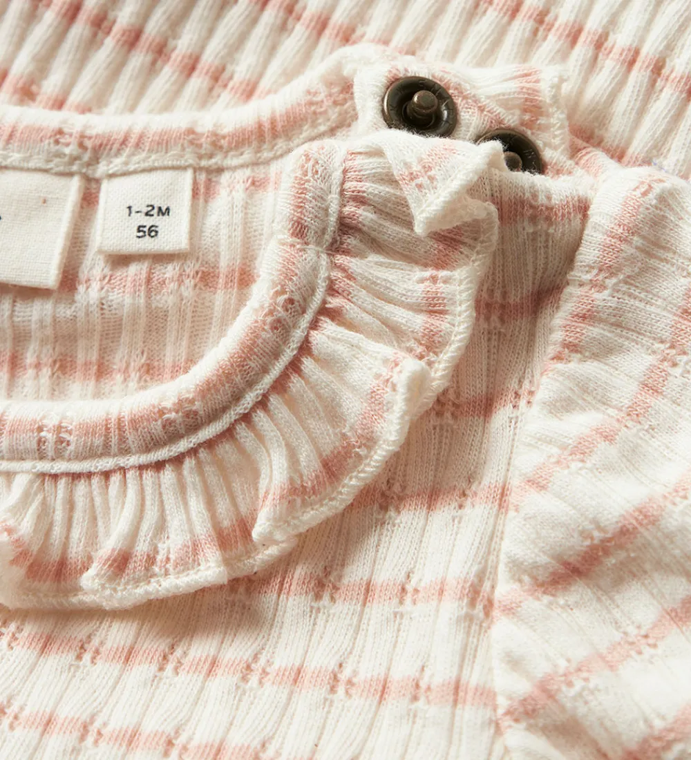 Charmerende Lil’ Atelier body med lange ærmer og et fint stribet mønster i rosa og hvid. Bodyen har en delikat flæsedetalje ved halsudskæringen, hvilket giver et elegant udtryk. Lil’ Ateliers body har praktiske trykknapper ved venstre skulder samt i bunden for nem beklædning.