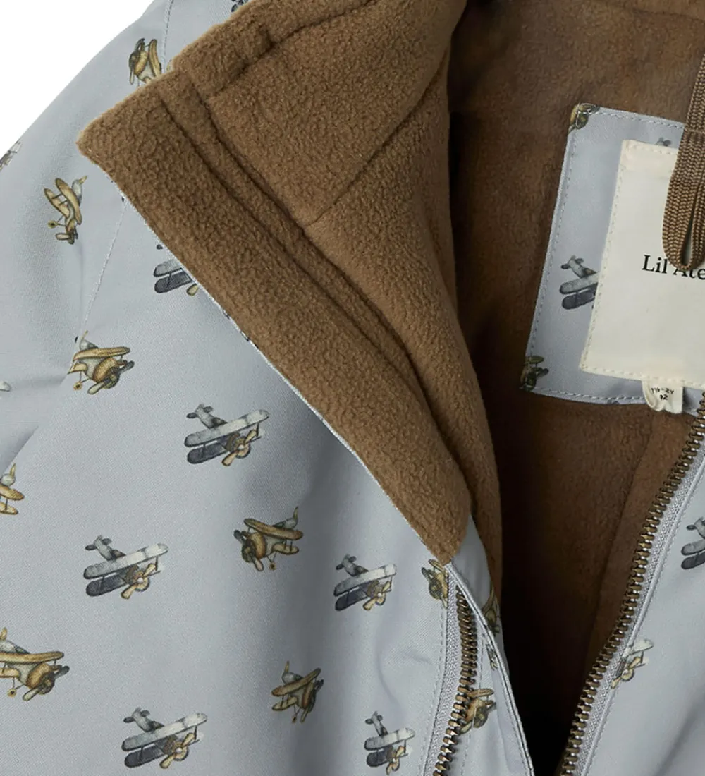 Lil’ Atelier flyverdragten har en aftagelig hætte med trykknapper, og en skjult elastikkant med fleece-for i åbningen, så den sidder tæt om ansigtet. Flyverdragten har en lynlåsåbning med en indvendig vindstolpe. Flyverdragten har et blødt fleece-for i kroppen, og den er lunt vatteret.