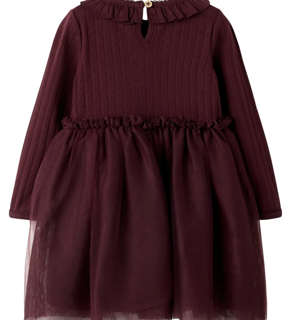 Elegant Lil Atelier kjole i bordeauxrød. Lil Atelier kjolen har fint hulmønster på den øverste del, mens den nerste del består af en lag økologisk bomuld inderst og flere lag mesh yderst. Kjolen har lange ærmer og en rund hals med flæsedetaljer og en knap i nakken.