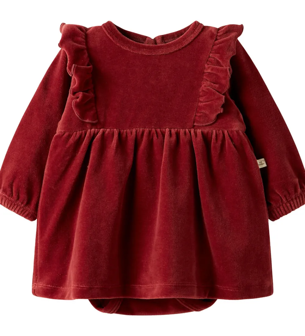 Elegant Lil’ Atelier kjolebody i dyb rød velour. Lil’ Atelier kjolebodyen har lange ærmer og fine flæsedetaljer ved skuldrene. Kjolebodyen har en let rynket nederdel for et klassisk udtryk, og den åbnes i nakken med en knap samt mellem benene med trykknapper.