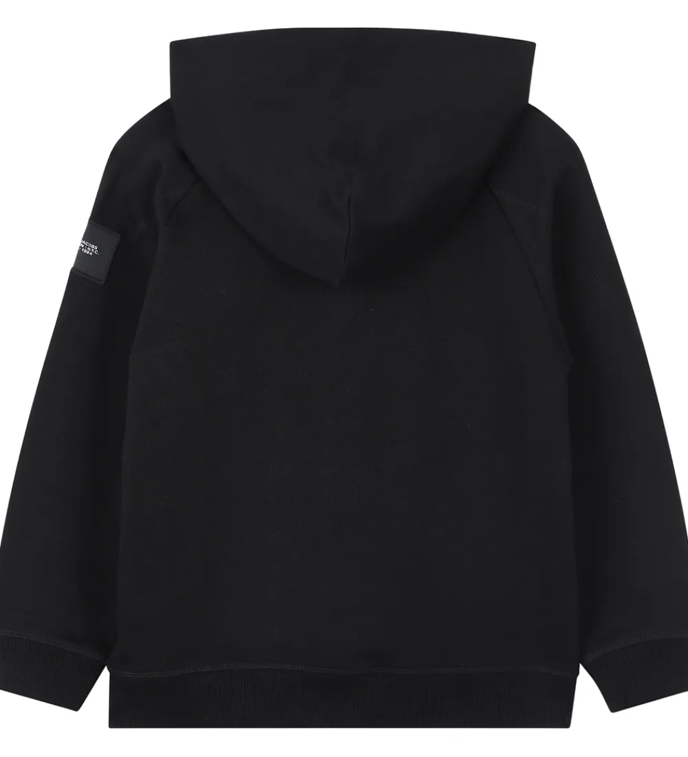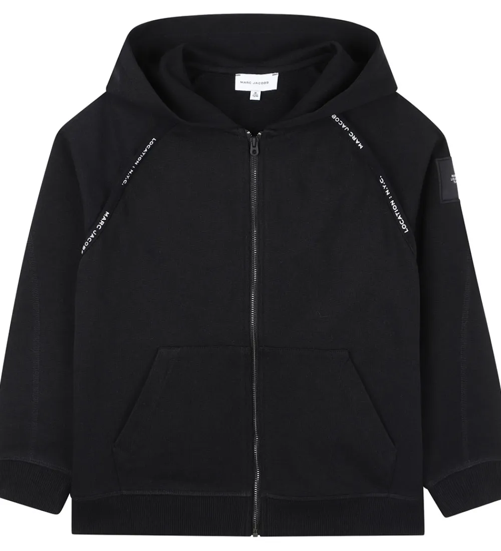 Stilfuld Little Marc Jacobs cardigan i sort sweat, og foran skuldrene er der hvide logostriber. Little Marc Jacobs cardiganen har en hætte med bomuldsfor, og den har brede ribkanter. Cardiganen åbnes med en lynlås, og fortil sidder der store, praktiske lommer.