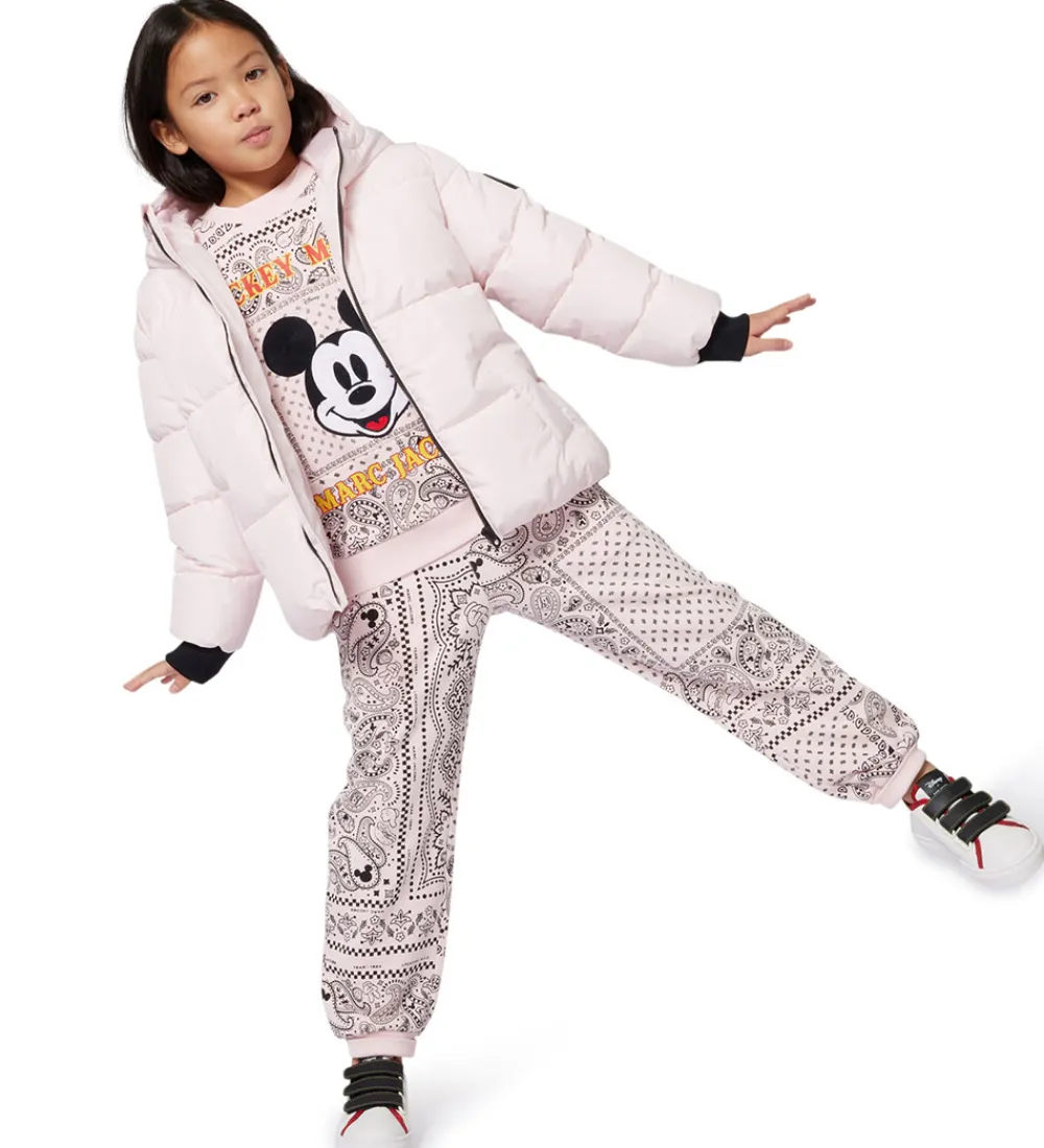 Flot Little Marc Jacobs dynejakke i rosa, og på hætten og ned ad bagsiden af ærmerne er der sorte logostriber.