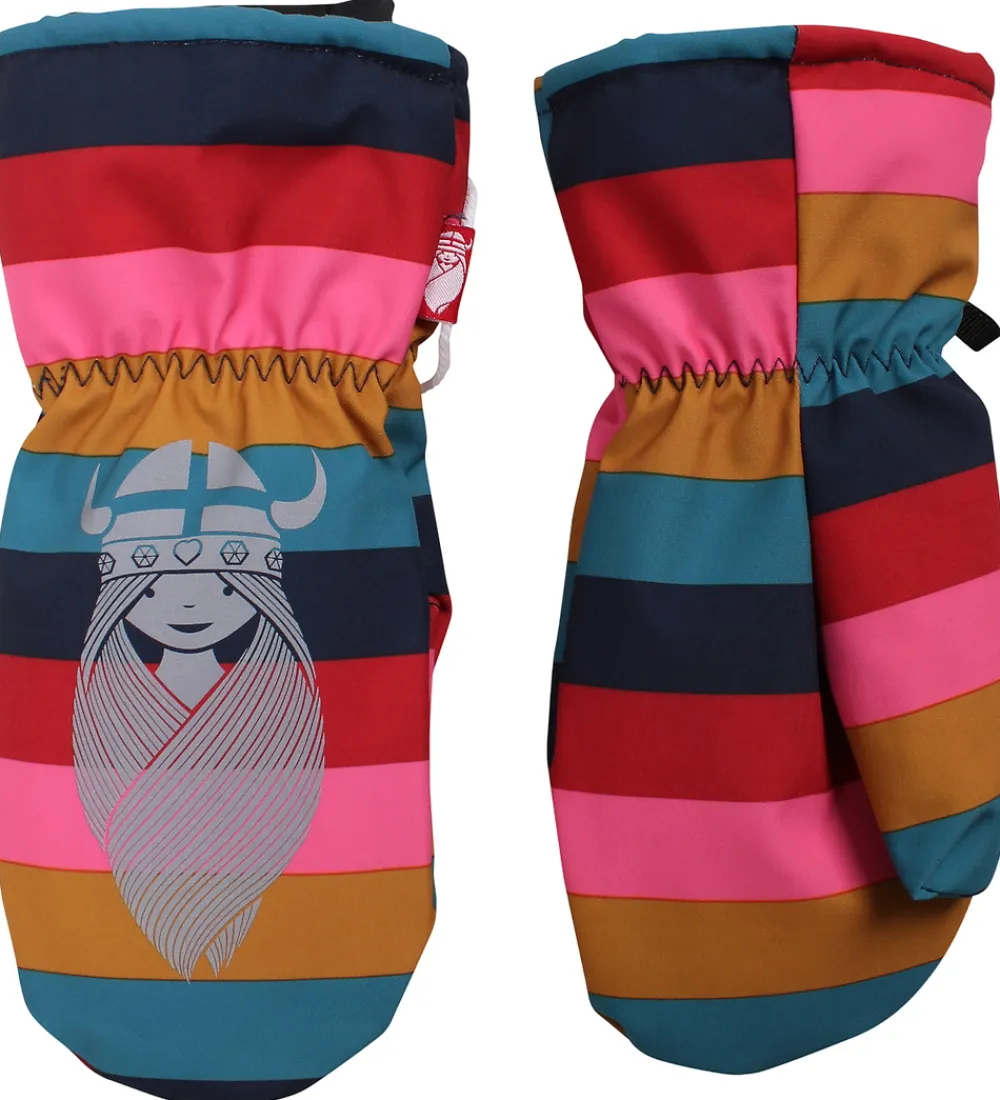 Fine Danefæ luffer med striber i pink, rød, navy, petroleumsblå og karrygul og et refleks-vikingeprint på håndryggen.