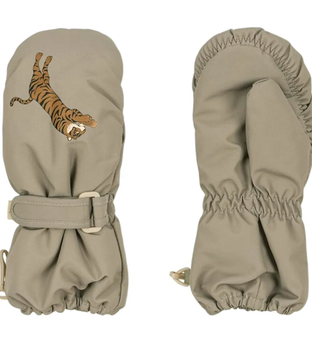 Skønne Konges Sløjd luffer i en støvet grøn med et lille tigerprint på toppen. Konges Sløjd lufferne er godt vatteret og har en elastikkant ved åbningerne der holder kulde og vind ude, samt en velcrorem ved håndleddene så de kan strammes godt ind.