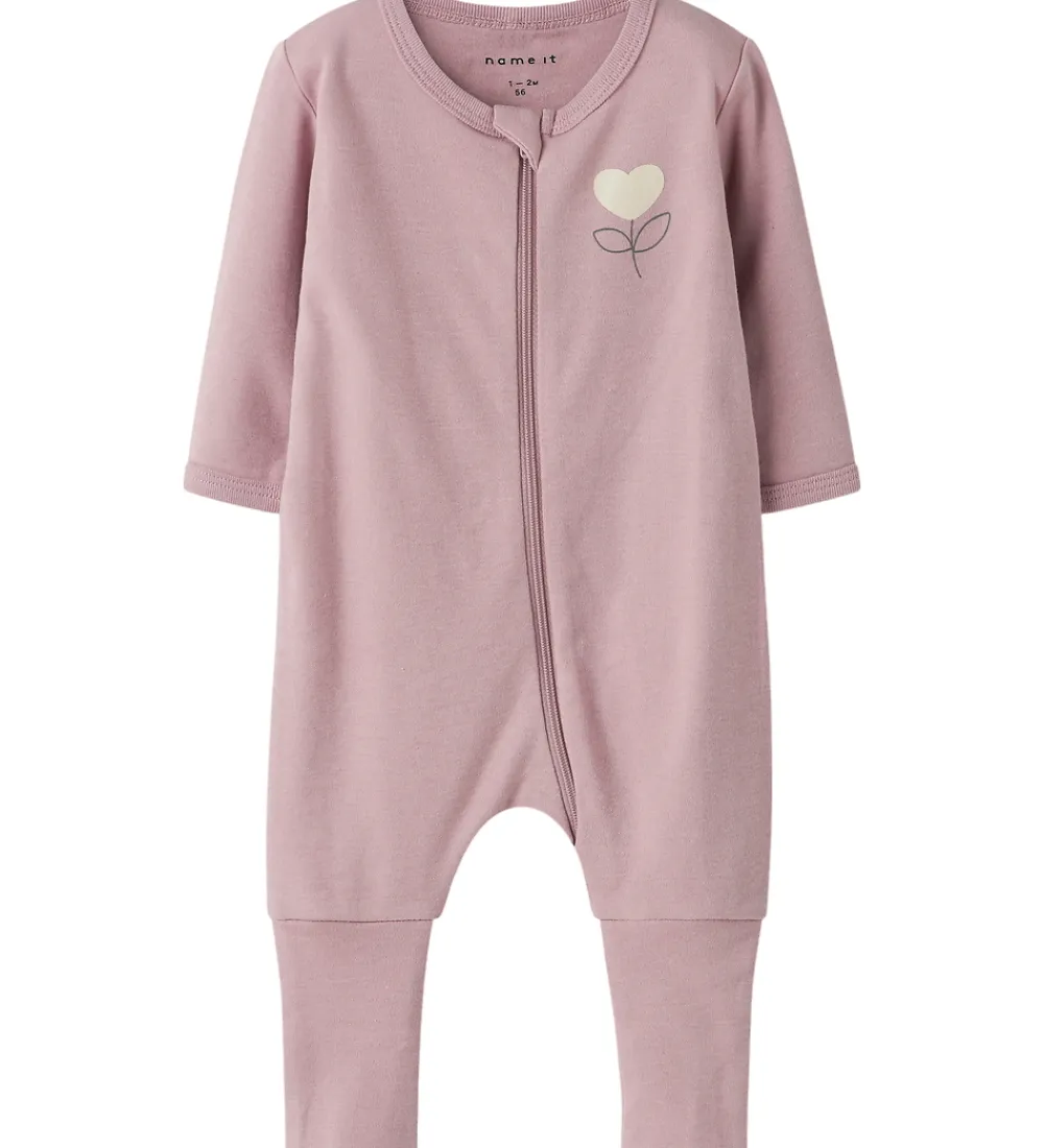 - Støvet rosa med print af en blomst med er hjerte på toppen i beige på venstre bryst.