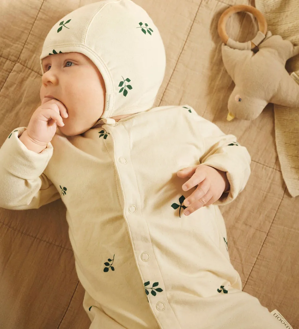 Dejlig Moonboon natdragt med babyhjelm i cremehvid med alloverprint af mørkegrønne bladgrene. Moonboon natdragten med babyhjelm leveres i en fin gaveæske og er lavet i samarbejde med H.C. Andersens Hus.