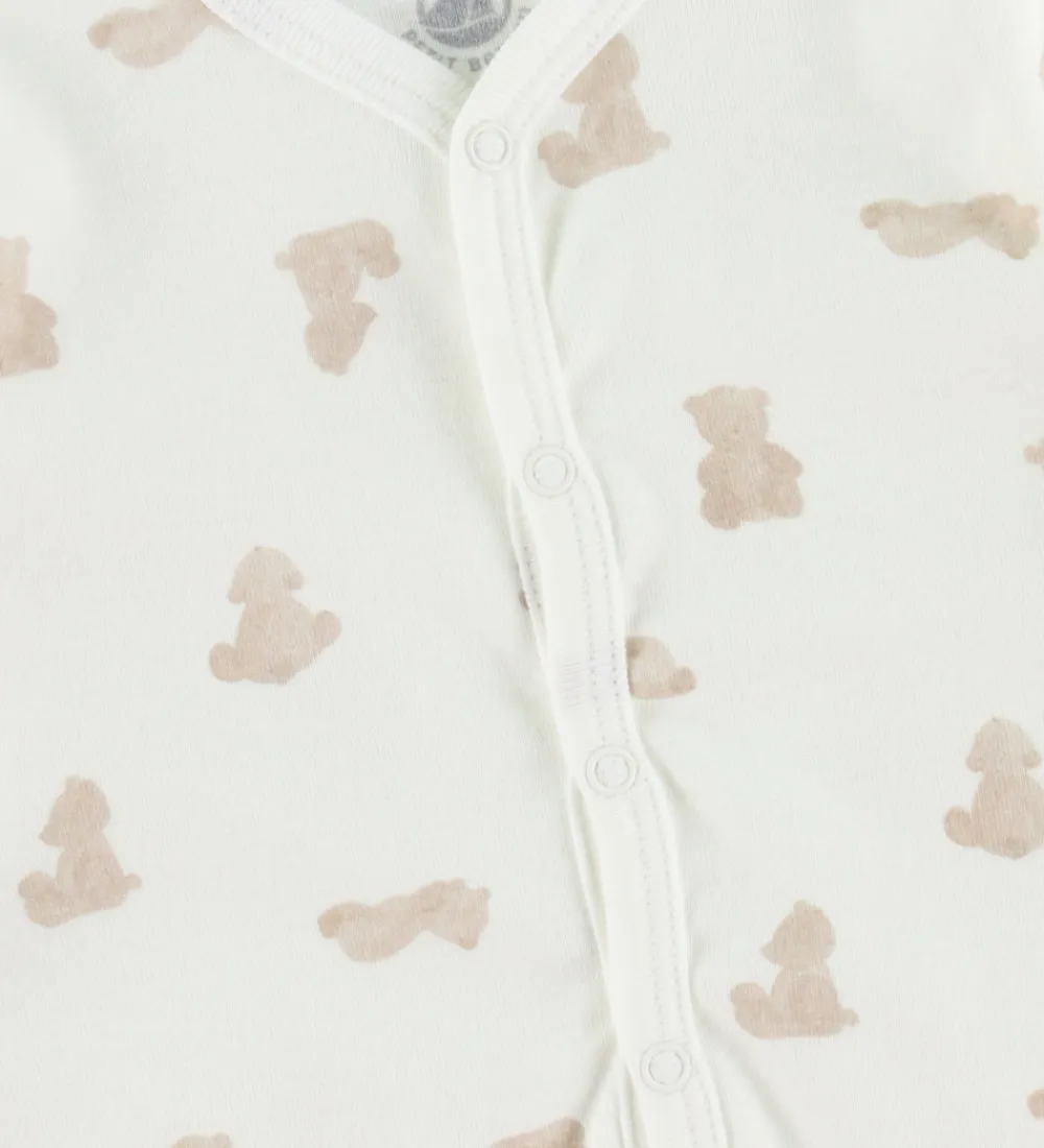 Charmerende Petit Bateau natdragt i en lys cremefarve med et mønster af brune bamser. Den har lange ærmer og ben, og den lukkes med trykknapper ned ad fronten og hele vejen ned ad buksebenene. Petit Bateau prioriterer detaljer og kvalitet i hver enkel natdragt.