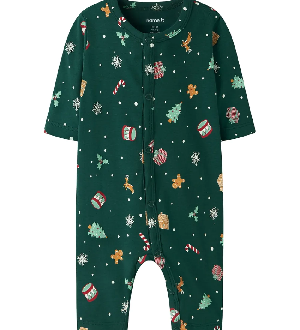Flot natdragt fra Name It i mørkegrøn med et festligt juleprint. Natdragten har lange ærmer og en rund halsudskæring. Den lukkes fortil med trykknapper fra hagen til venstre fod.