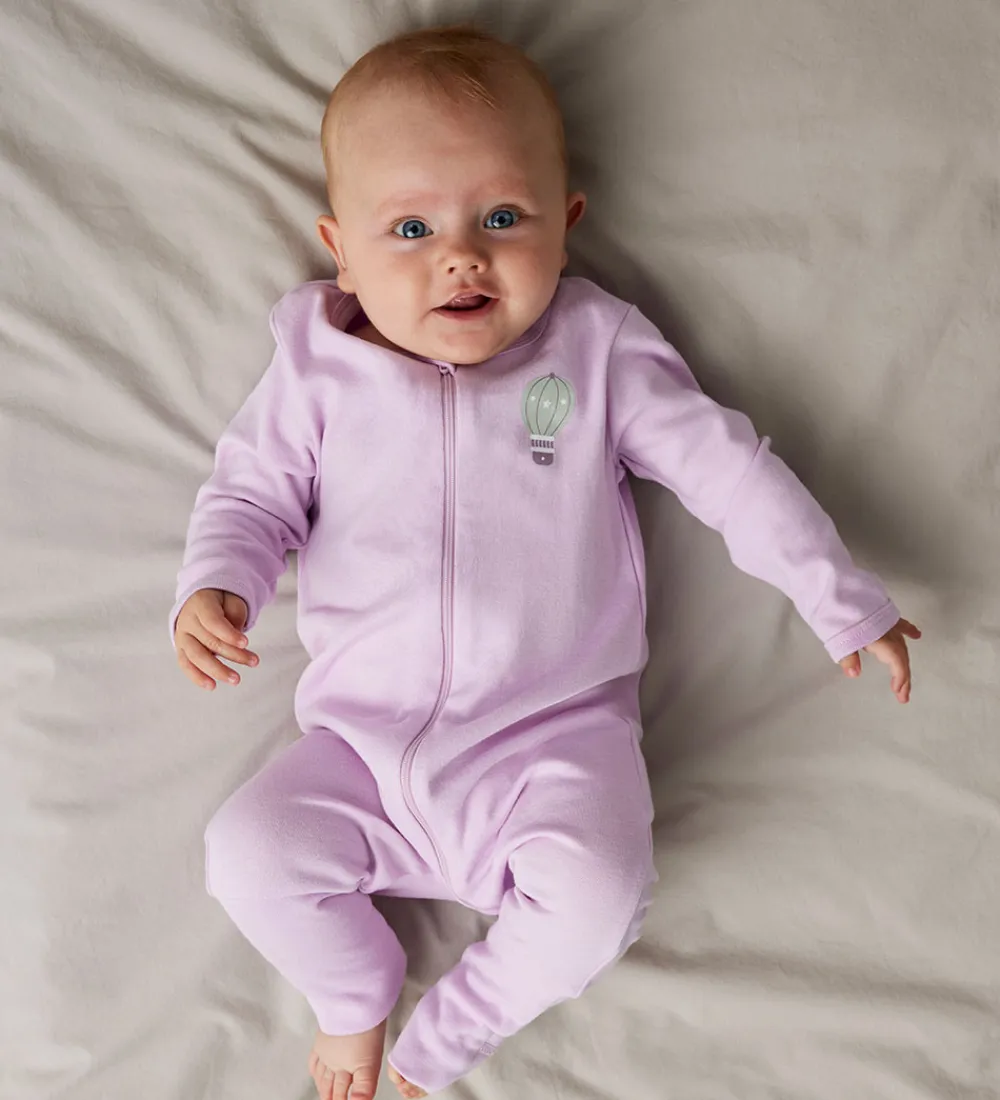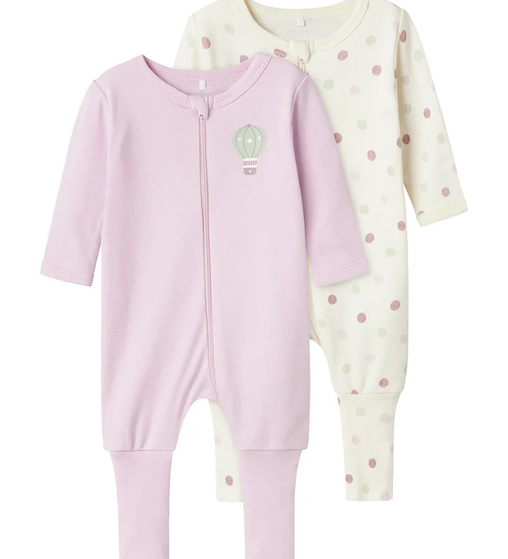Name It natdragterne har lange ærmer med smalle ribkanter og lange ben med praktisk ombuk. Natdragterne åbnes fortil med en lynlås ned ad fronten og ned ad venstre ben. Ved halsåbningen er der desuden hagebeskytter.