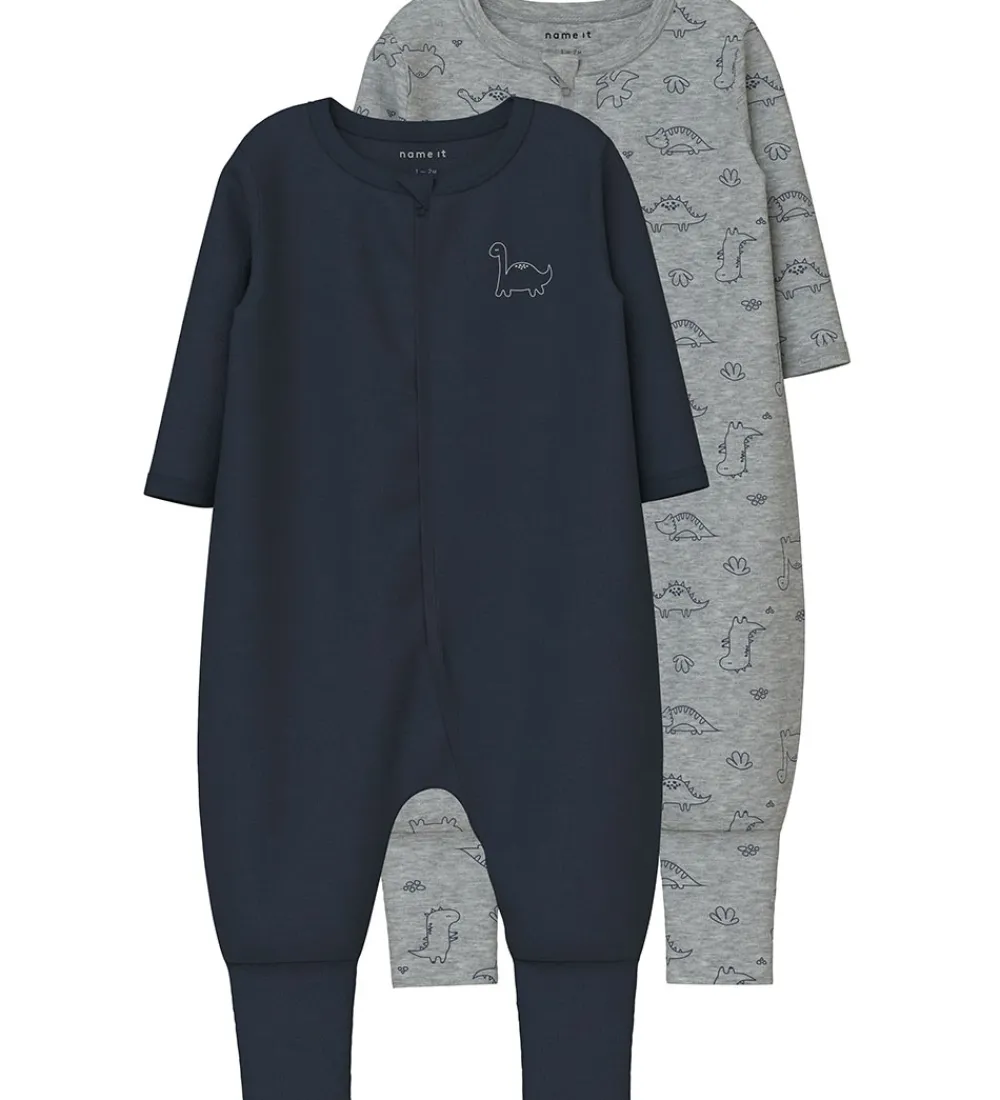 Name It natdragterne har lange ærmer og en rund halsudskæring. De åbnes fortil med en lynlås med hagebeskytter og indvendig stolpe, og som starter i halsåbningen og slutter på venstre ben. Som en smart detalje kan natdragterne bukkes op om fødderne, hvis det ønskes. De er lavet i en strækbar bomuldskvalitet.