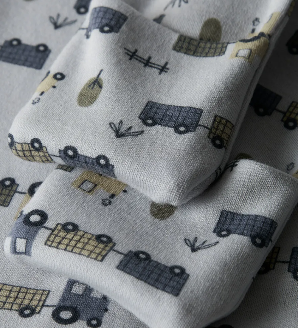 Charmerende Name It natdragt i en lys blågrå nuance med et alloverprint af traktorer med vogne og træer. Natdragten åbnes med en praktisk lynlås fra hagen til venstre knæ. Lynlåsen har indvendig vindstolpe og hagebeskytter. Natdragten har en rund halsudskæring og lange ærmer. Den har lange ben med ombuk til lukkede fødder. Natdragten er fremstillet af 100% merinould.