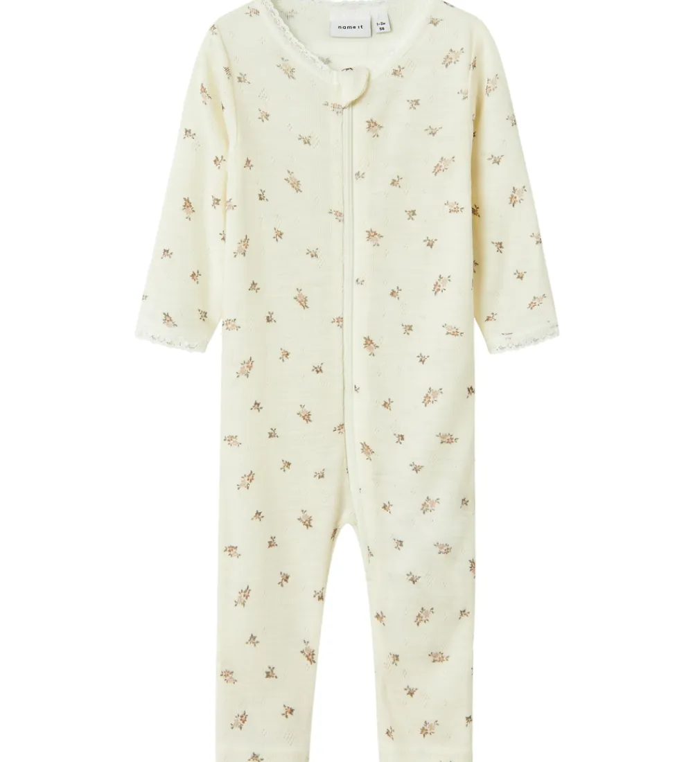 Elegant Name It natdragt med lange ærmer i en flot råhvid nuance. Natdragten er dekoreret med et diskret blomstermønster og åbnes foran med en praktisk lynlås med hagebeskytter øverst. Natdragten er fremstillet af lækkert merinould.