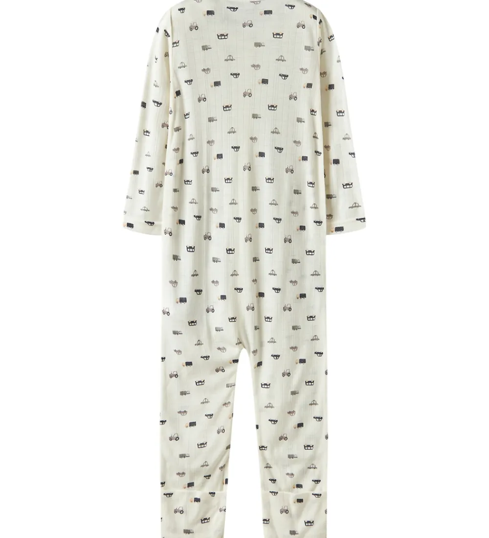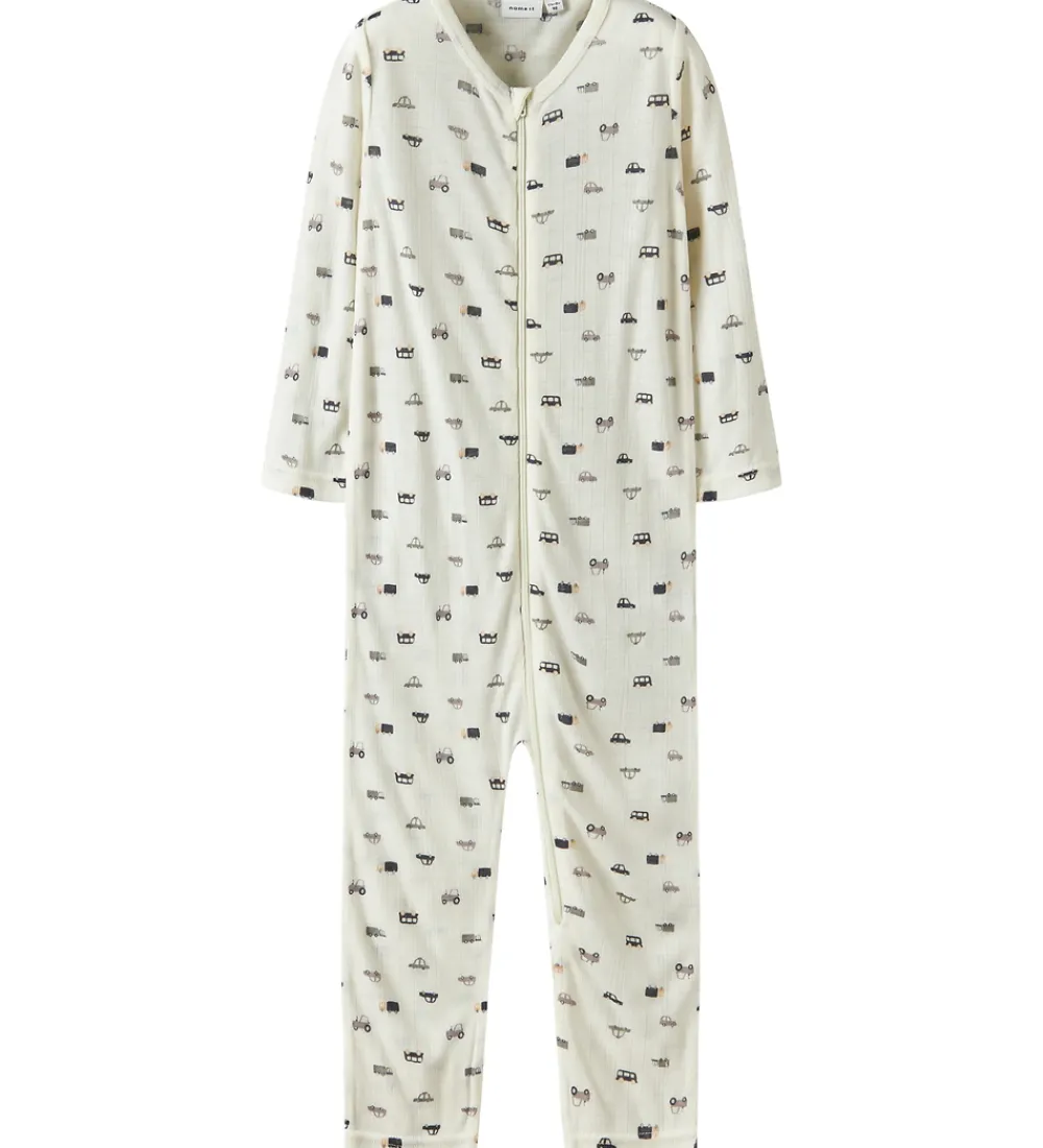 Sød Name It natdragt i hvid med print af små biler i blå og grå nuancer og med fin ribstruktur. Natdragten har en rund halsudskæring og lynlås fortil med hagesbeskytter og indvendig vindstolpe. Natdragten har lange ærmer og lange ben med mulighed for ombuk til lukkede fødder. Den er fremstillet i blødt og åndbart merinould.